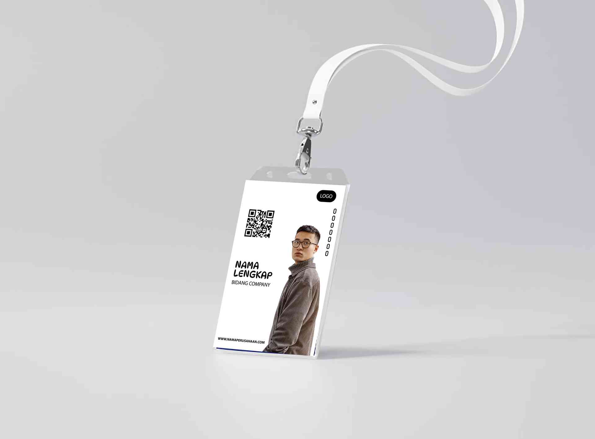 ID card ini dirancang dengan konsep minimalis modern berwarna dasar putih bersih, menampilkan foto profesional karyawan di bagian kanan dengan QR code di sisi kiri atas yang mempermudah akses data digital. Dilengkapi dengan nama lengkap, bidang company, nomor ID, logo perusahaan, dan website pada bagian bawah, desain ini menghadirkan kesan profesional, elegan, dan digital friendly. Sangat cocok untuk perusahaan startup, agency creative, atau corporate yang mengutamakan kecepatan akses data karyawan dalam aktivitas operasionalnya.