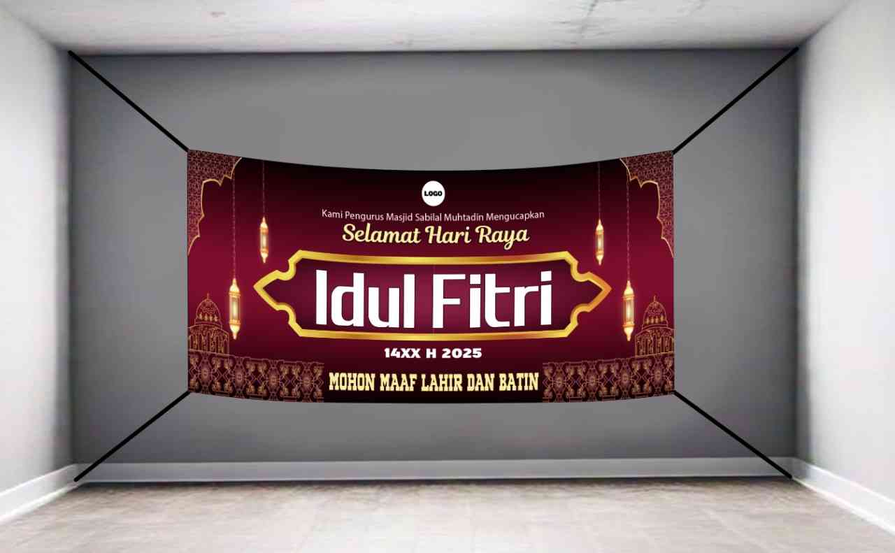 Baliho bertema Idul Fitri ini didesain dengan perpaduan warna merah dan gold yang elegan, dilengkapi dengan ornamen Islami seperti bulan sabit dan pol...
