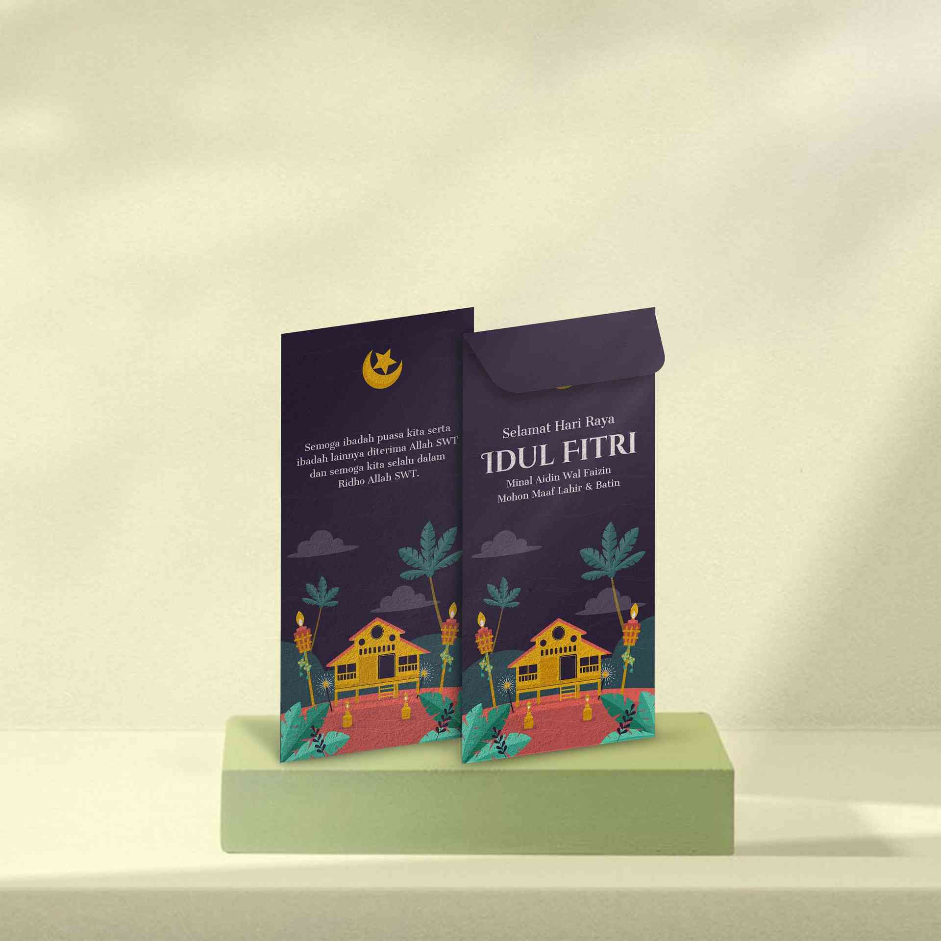 Amplop Lebaran di atas memiliki desain dengan latar belakang warna gelap yang elegan✨, dilengkapi ilustrasi rumah adat khas Nusantara yang dikelilingi...