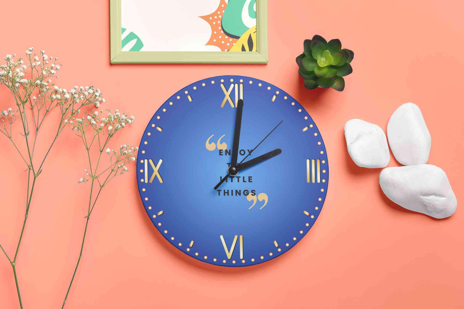 Desain jam ini memiliki konsep minimalis elegan, dengan kombinasi warna biru gradasi yang memberikan kesan mewah dan modern. Angka jam menggunakan ang...