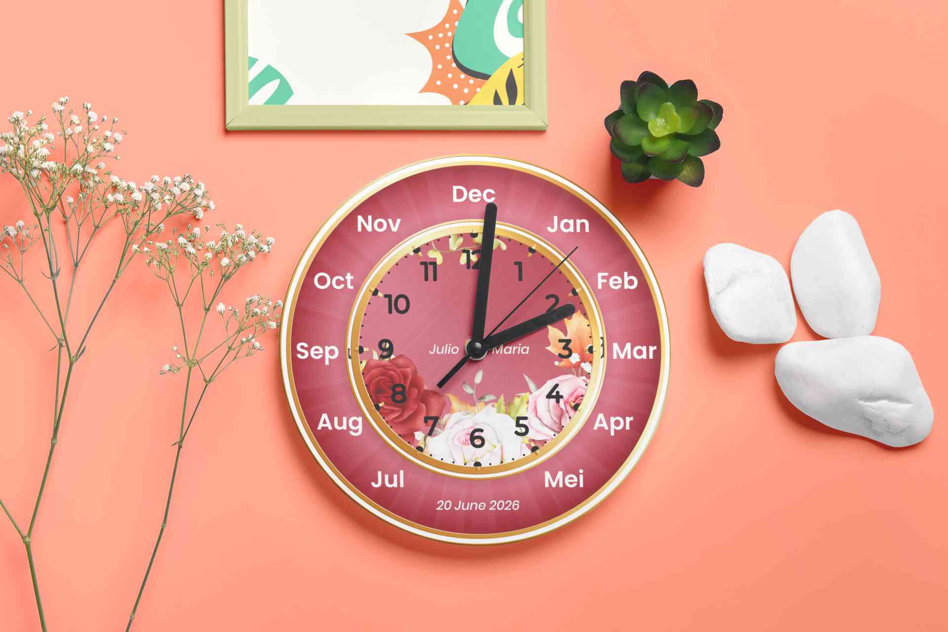 Desain jam ini mengusung konsep elegan dan romantis, cocok untuk memperingati momen spesial dalam kehidupan pasangan. Latar belakang jam berwarna putih bersih, memberikan kesan minimalis yang berpadu harmonis dengan elemen dekoratifnya. Angka jam ditampilkan dengan font klasik hitam, yang kontras dengan desain lingkaran dalam yang dihiasi dengan ornamen berwarna emas dan merah, menyerupai rangkaian bunga atau anyaman hias yang melambangkan keindahan dan keabadian cinta. Di tengah desain, terdapat nama pasangan "Ben & Anna" yang ditulis dengan font elegan, ditemani oleh ilustrasi dua cincin emas yang saling bertautan, simbol universal dari ikatan pernikahan. Tepat di bawahnya, tertulis tanggal 08.07.2017, yang kemungkinan besar merupakan tanggal pernikahan atau peringatan penting bagi pasangan tersebut. Desain ini sangat cocok sebagai hadiah pernikahan, anniversary, atau dekorasi rumah pasangan, mengabadikan momen berharga dalam bentuk jam yang tidak hanya berfungsi sebagai penunjuk waktu tetapi juga sebagai simbol perjalanan cinta yang abadi.