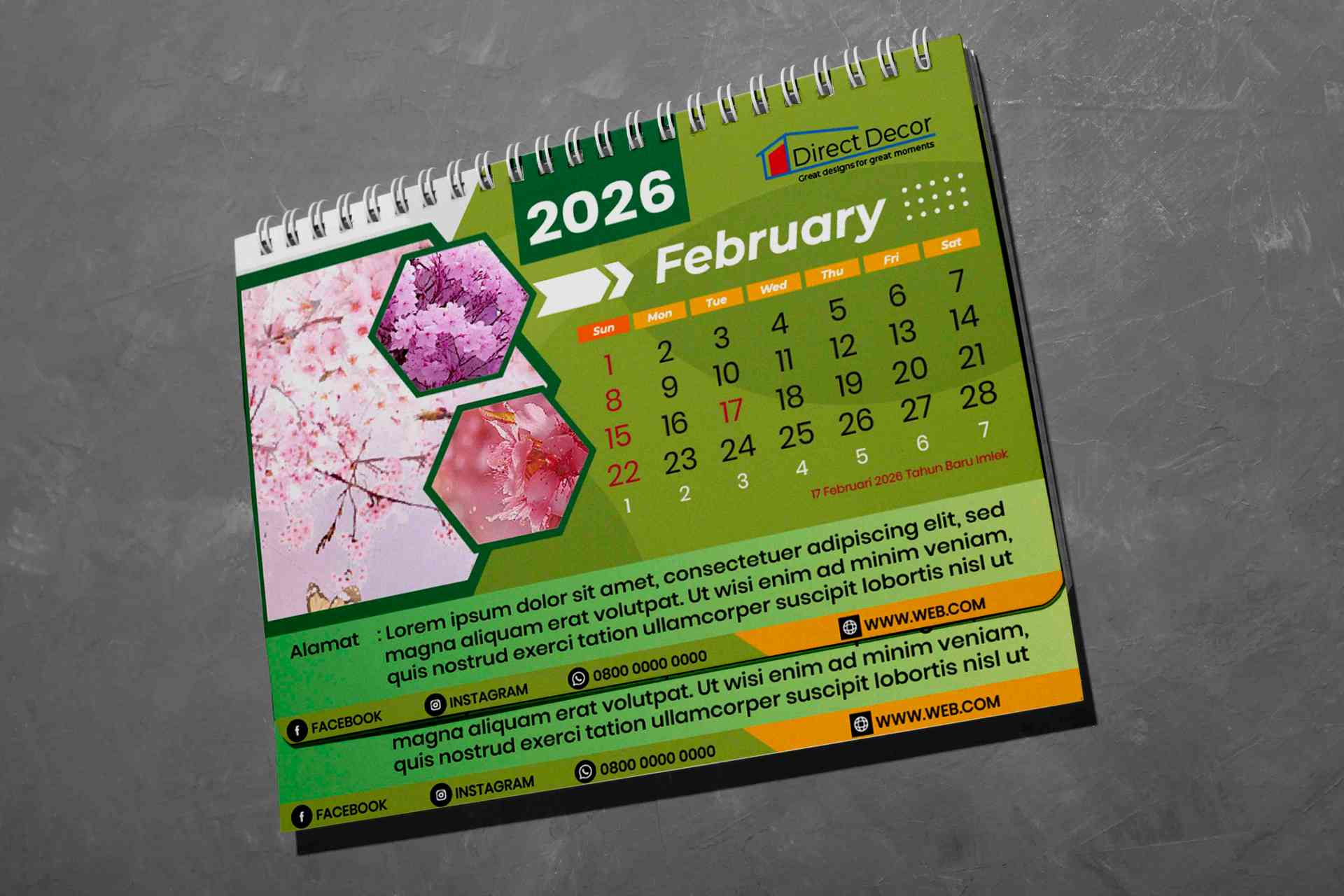 Kalender meja dengan ukuran A5 landscape (21 cm x 14.8 cm) ini dirancang dengan tampilan minimalis namun tetap elegan. Desainnya memadukan elemen modern dengan sentuhan warna yang menenangkan untuk menciptakan suasana profesional dan menarik.