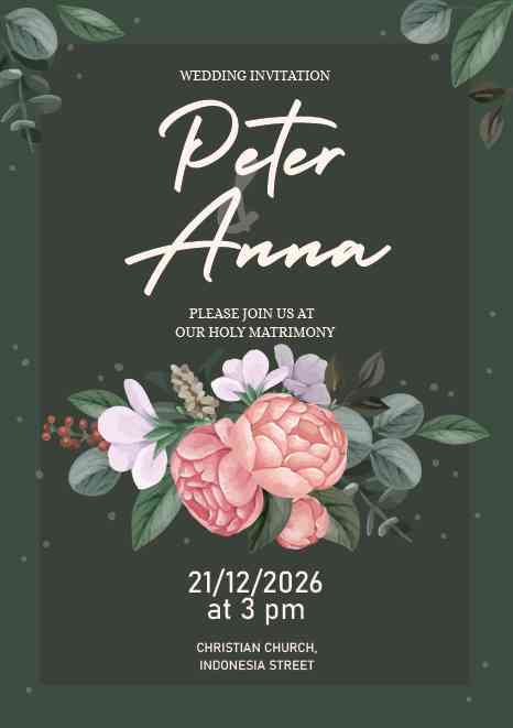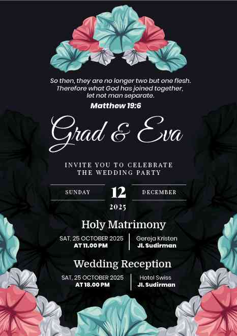 Undangan pernikahan ini memiliki desain elegan dengan latar hitam solid yang menonjolkan aksen bunga berwarna merah muda, biru kehijauan, dan putih se...