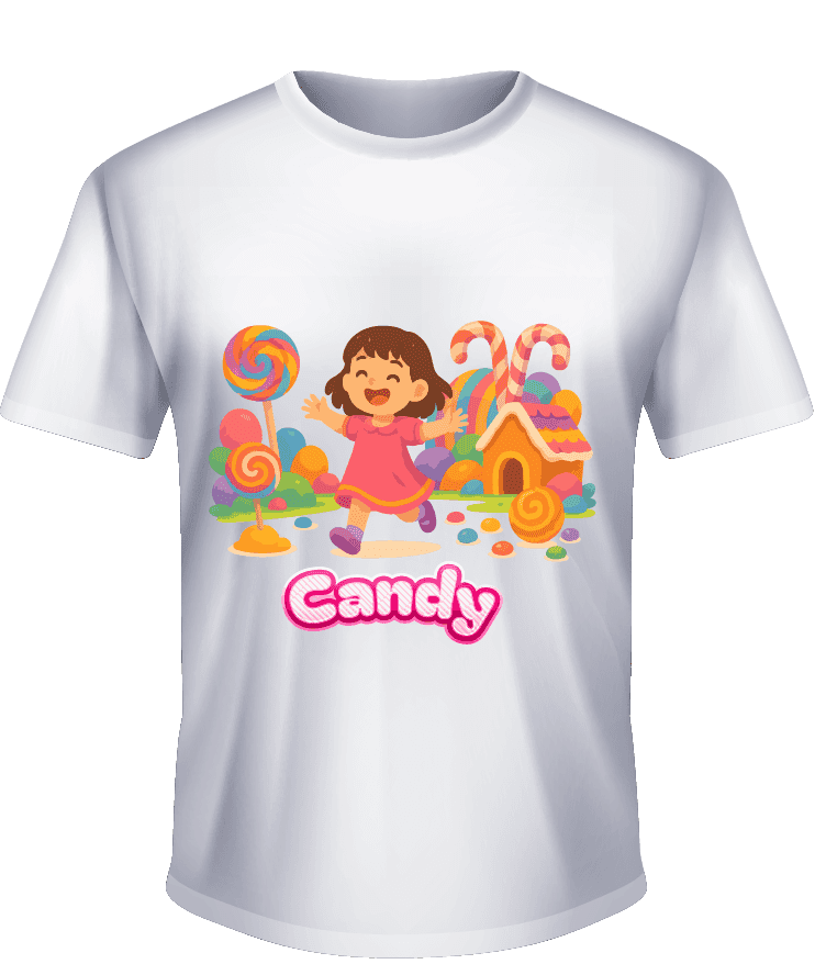 Desain kaos ini menampilkan seorang gadis kecil yang sedang berlari dengan ceria di tengah dunia permen yang penuh warna. Di sekelilingnya terdapat be...