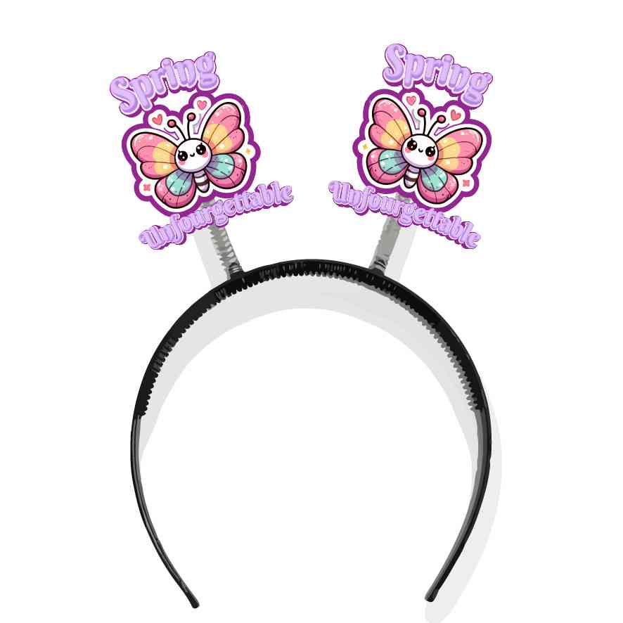 Bando ulang tahun bertema kupu-kupu ungu ini berbentuk melingkar mengikuti bentuk kepala, dengan dua dekorasi berbahan cetak yang menampilkan ilustras...