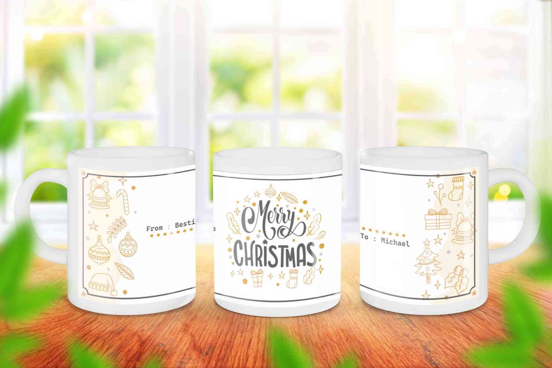 Mug berbentuk silinder dengan pegangan di sisi kanan, menampilkan desain khas bertema Natal dan Tahun Baru. Warna dominan adalah putih, dengan elemen...