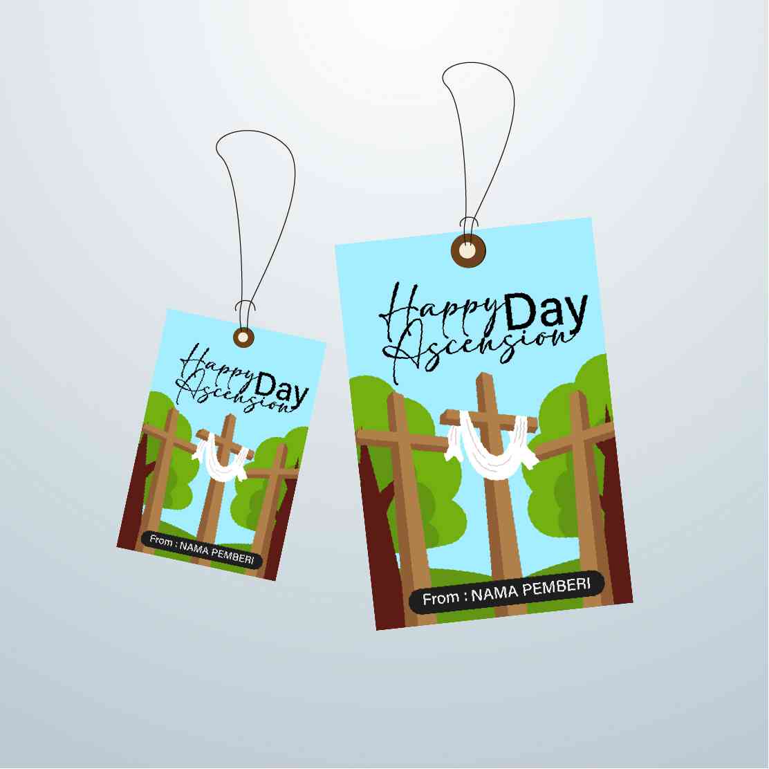 Hangtag dengan latar awan dan salib dominan ini menggambarkan kenaikan ke surga dalam nuansa cerah dan penuh harapan. Ideal untuk acara ibadah atau ha...