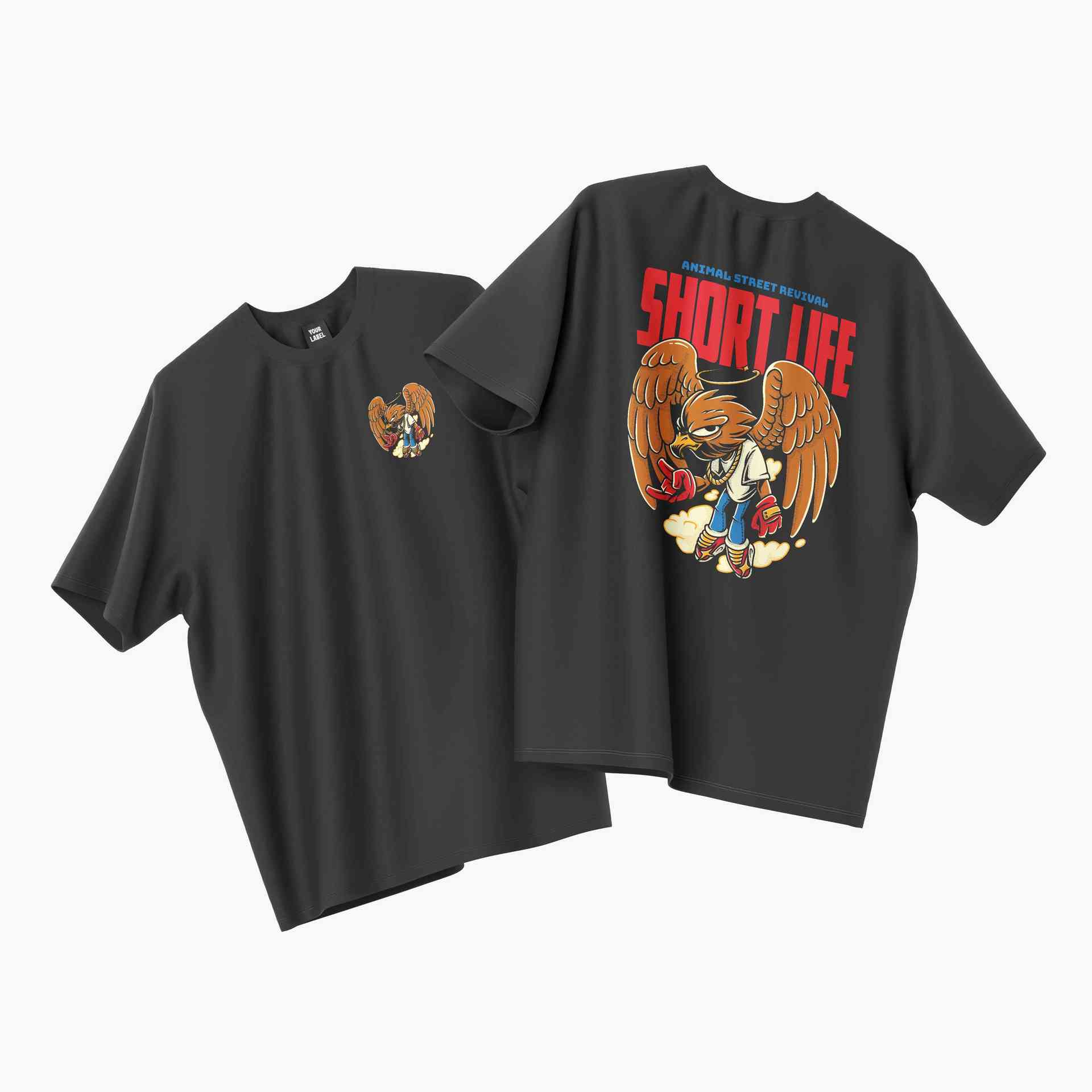 Kaos ini mengusung karakter burung petarung dengan sayap lebar dan sarung tinju, serta slogan "SHORT LIFE" yang sangat mencolok. Warna merah...