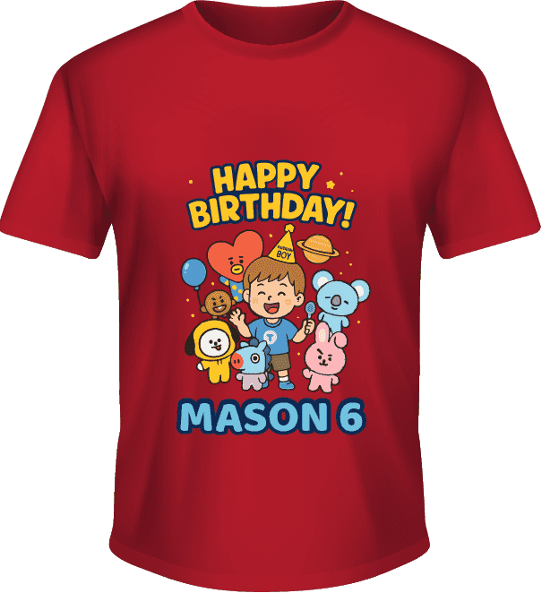Desain kaos ini menampilkan ilustrasi anak laki-laki yang sedang merayakan ulang tahun ke-6 bersama karakter-karakter menggemaskan dari dunia BT21. De...