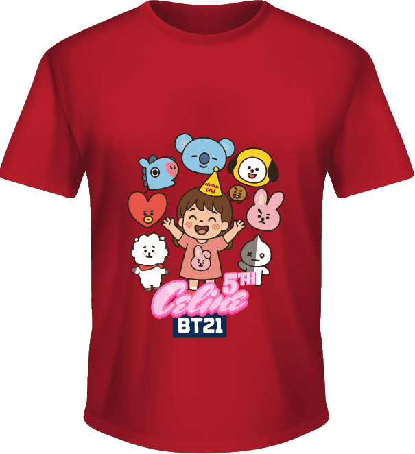 Kaos ulang tahun ini dirancang khusus untuk anak perempuan berusia 5 tahun dengan tema karakter BT21 yang menggemaskan. Di bagian tengah terdapat ilus...