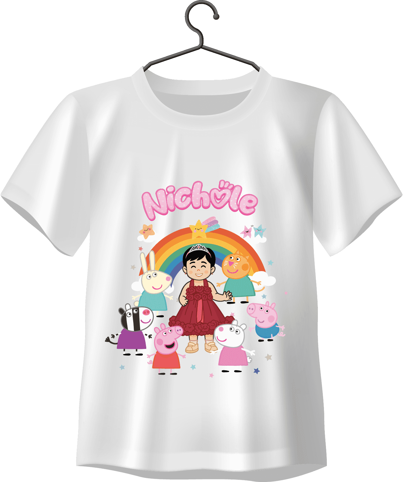 Kaos ulang tahun anak perempuan ini menampilkan desain utama karakter kartun Peppa Pig dan teman-temannya dengan warna dominan putih pada dasar kaos s...