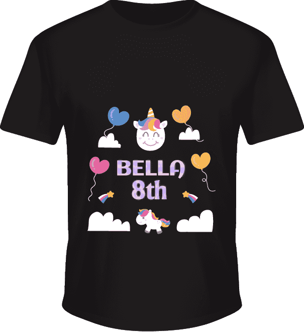 Kaos ulang tahun ini dirancang dengan nuansa ceria namun elegan, menampilkan latar belakang hitam yang kontras dengan ilustrasi unicorn berwarna paste...