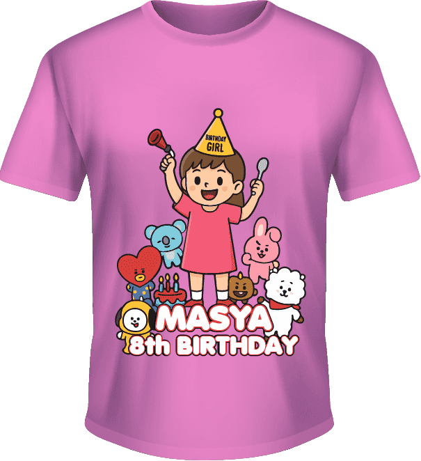 Desain kaos ini menampilkan nuansa meriah khas ulang tahun anak perempuan dengan dominasi warna pink yang ceria. Di tengah desain terdapat karakter an...