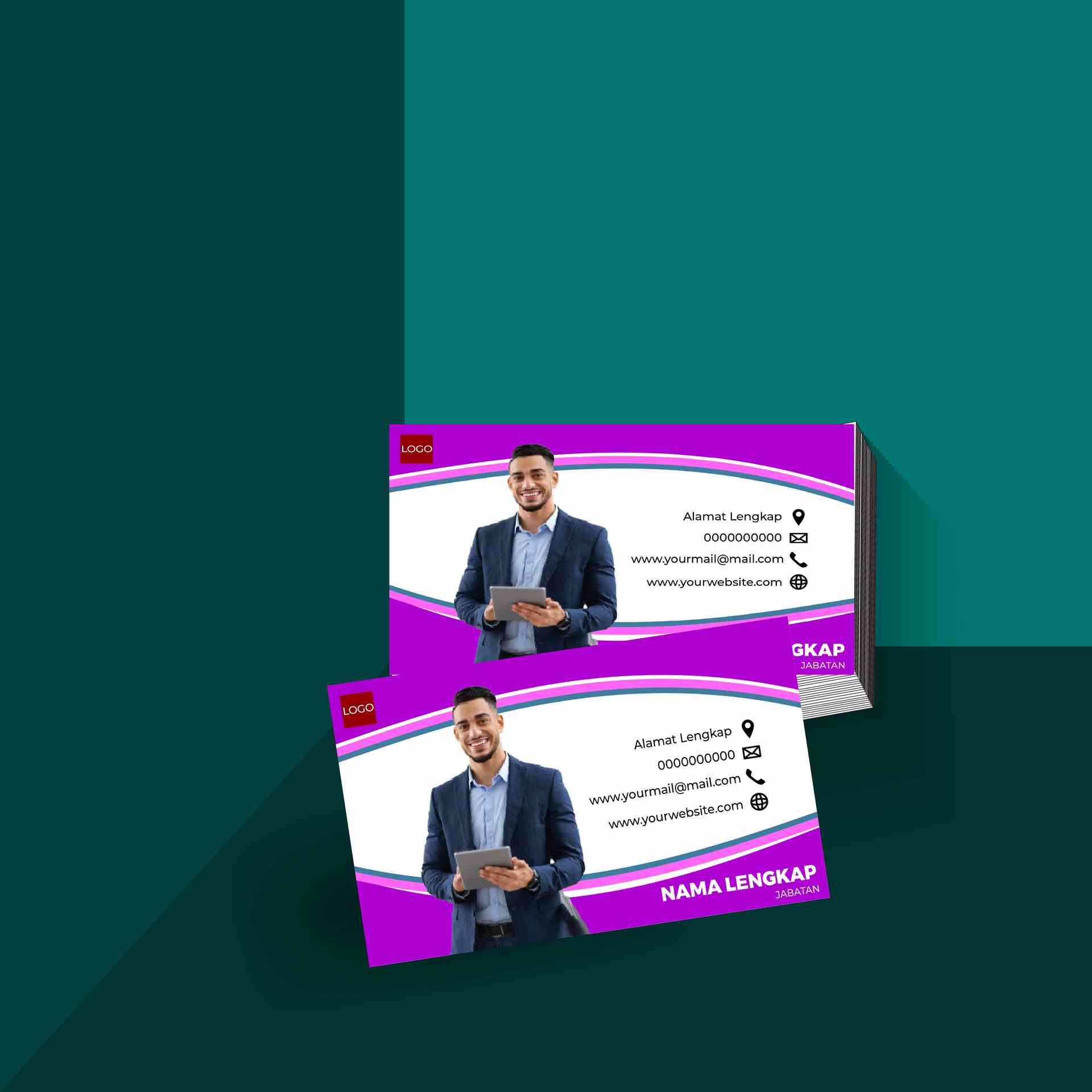Kartu nama profesional dengan format horizontal ini menggunakan kombinasi warna ungu vibrant sebagai dominan, dipadukan aksen putih serta sedikit unsu...