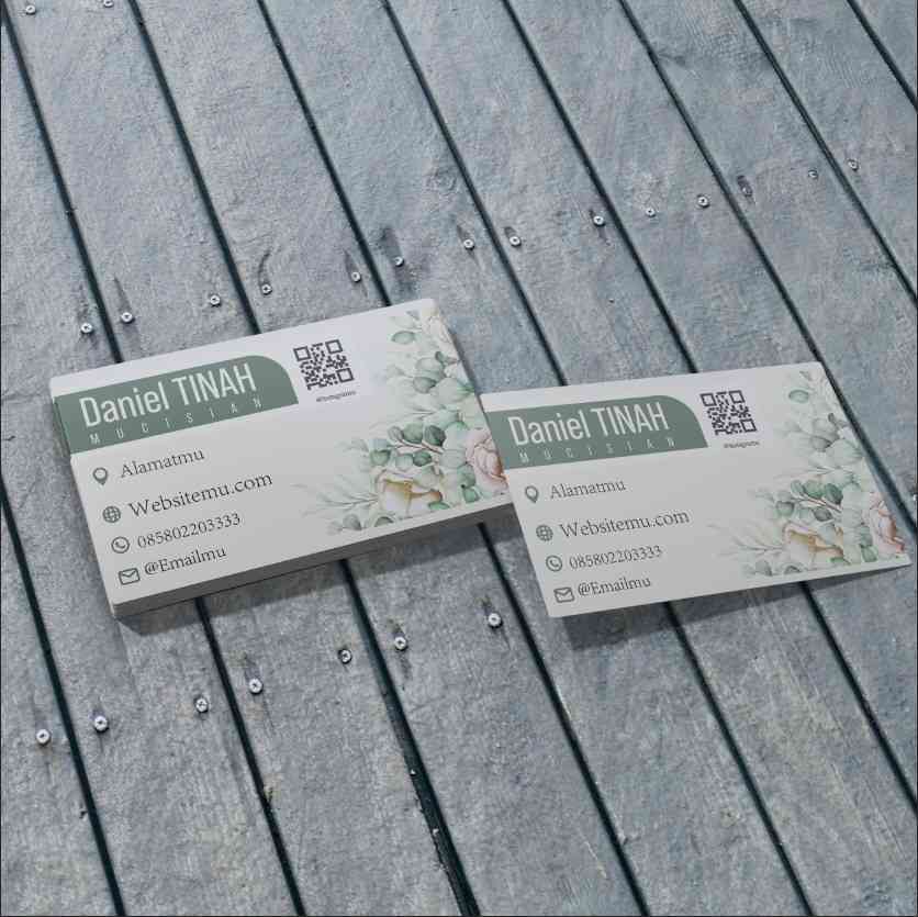 Kartu nama ini menampilkan desain artistik dan elegan dengan dominasi warna hijau sage dan aksen floral di sisi kanan yang memberikan kesan natural, t...