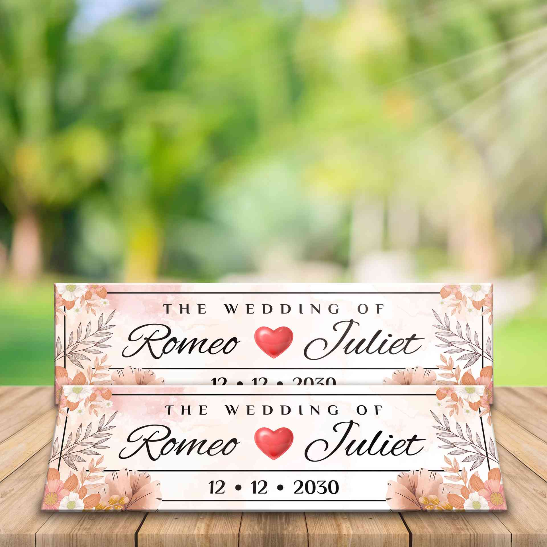 Wedding plat di atas menampilkan desain romantis dan elegan dengan tulisan dalam kombinasi huruf kapital dan kaligrafi yang anggun. Simbol hati merah...