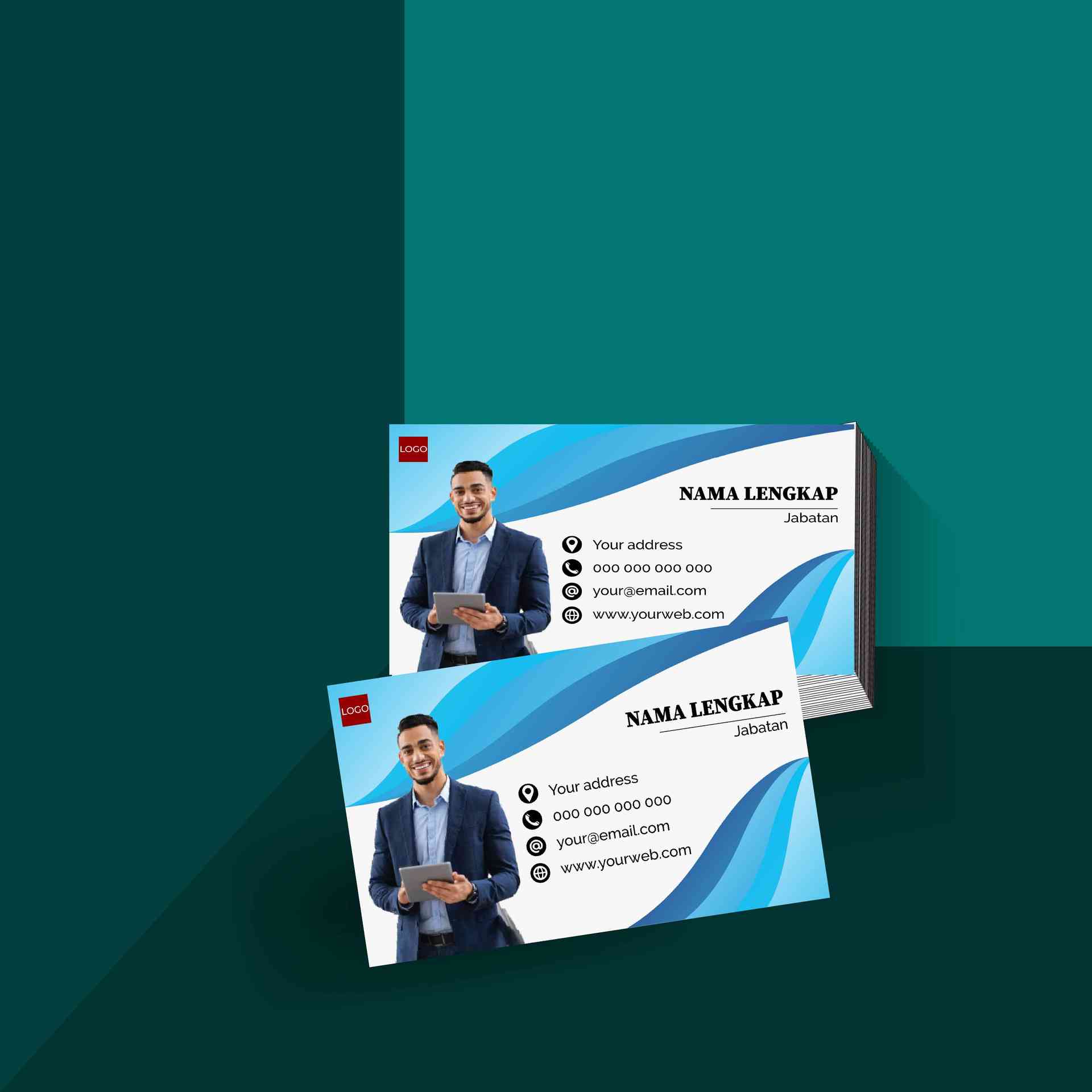 Kartu nama persegi panjang dengan nuansa biru dan putih ini menonjolkan aksen gelombang dinamis di bagian tepi, menampilkan karakter formal dengan foto profesional di sisi kanan, serta detail kontak seperti alamat, nomor telepon, dan email di sisi kiri. Warna utama biru dan putih menciptakan kesan elegan dan bersih, dengan tambahan aksen oranye kecil pada area logo perusahaan. Desain minimalis namun modern, memadukan elemen visual tegas dan tipografi jelas, cocok untuk kebutuhan profesional di bidang usaha korporat atau jasa, menargetkan kalangan eksekutif dan profesional muda untuk memperkuat impresi formal dan kredibel saat networking atau presentasi bisnis.