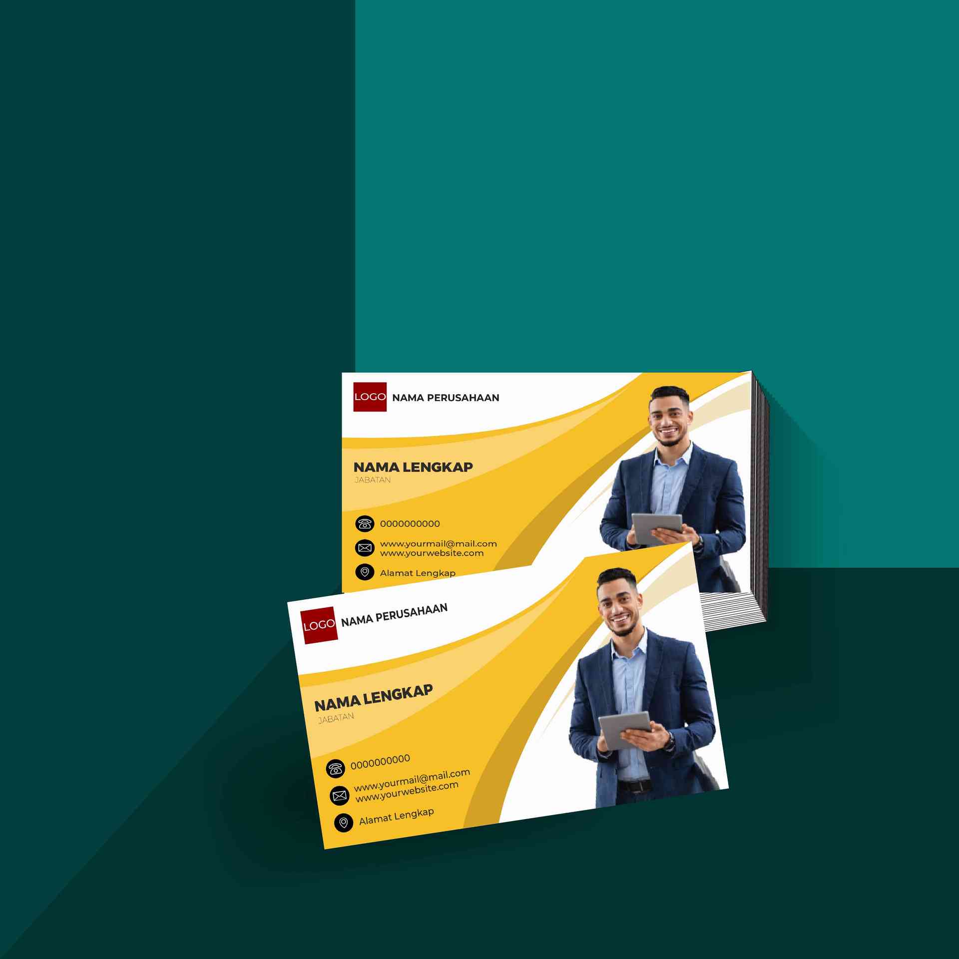 Kartu nama profesional berbentuk persegi panjang horizontal ini didominasi warna kuning cerah dengan sentuhan putih dan aksen gelombang dinamis, menam...