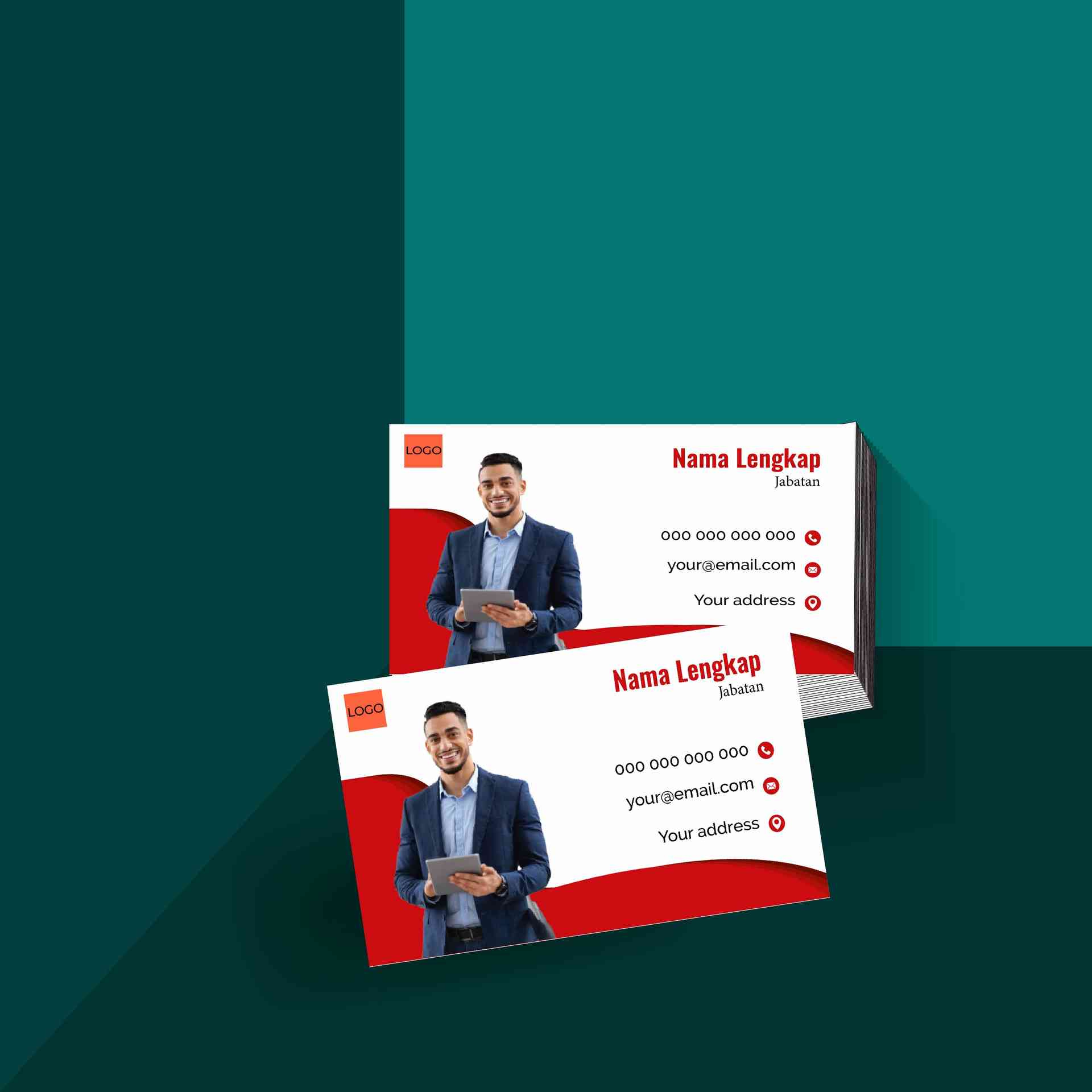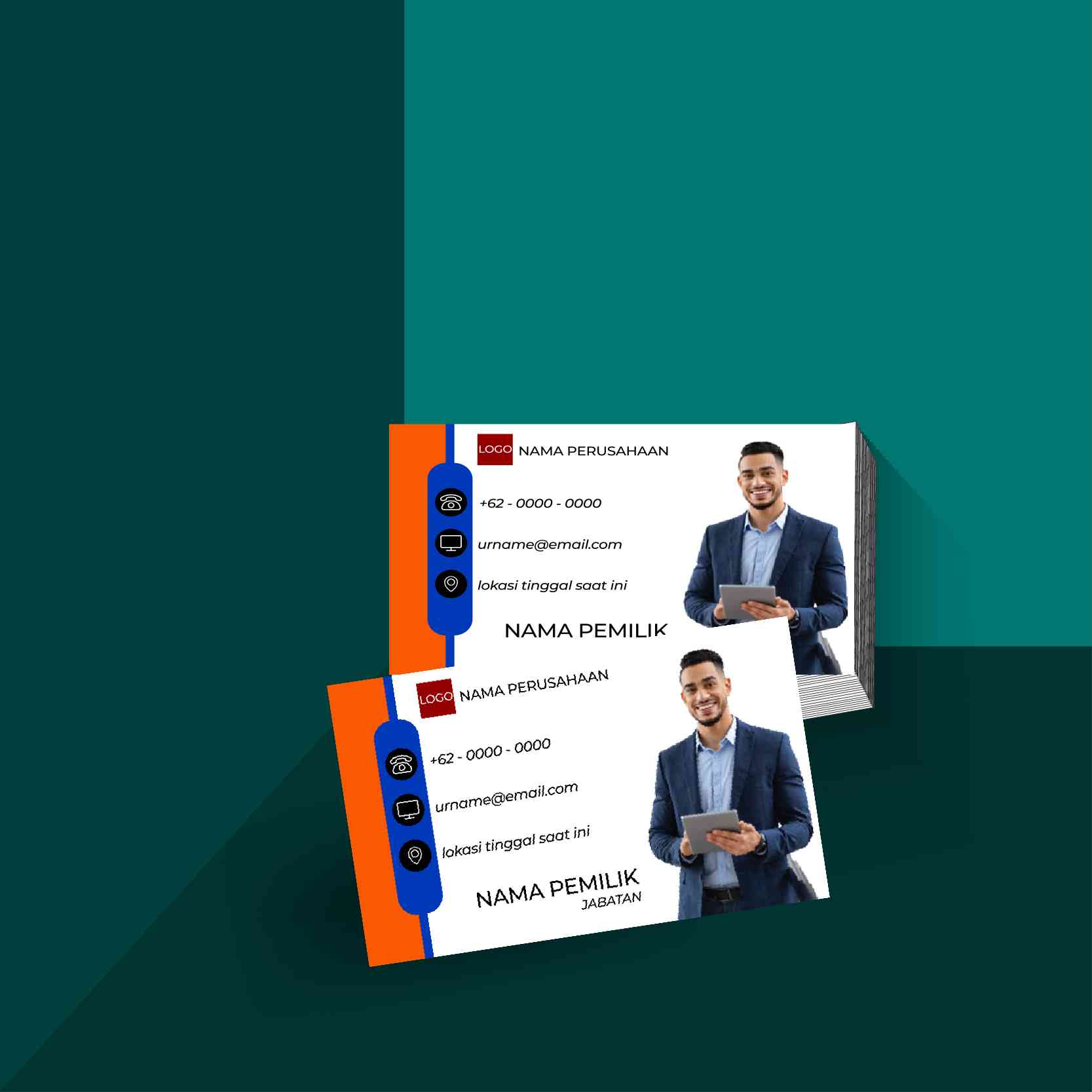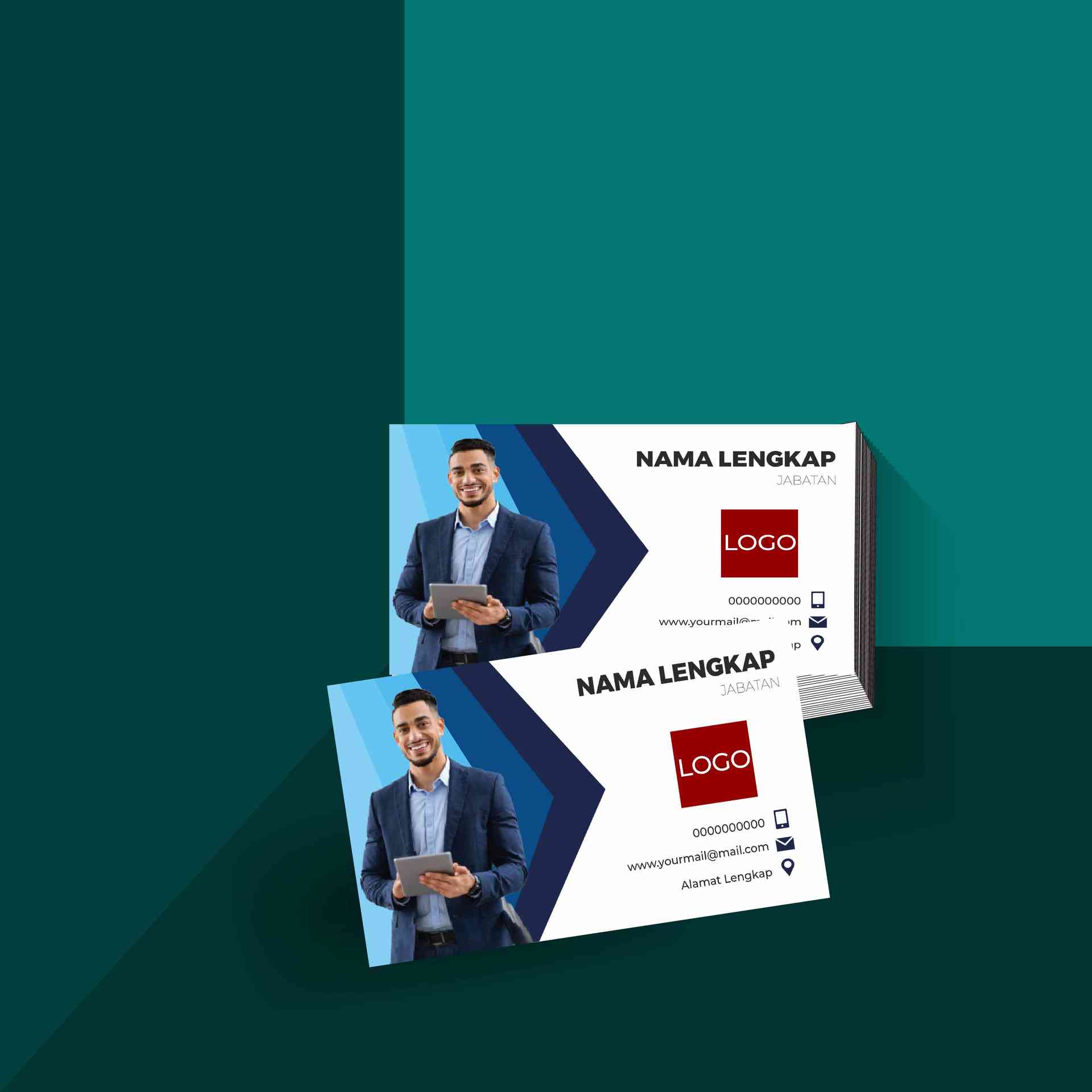Kartu nama korporat ini berbentuk persegi panjang dengan nuansa biru ombak futuristik yang memberi kesan modern dan profesional. Warna dominan adalah gradasi biru dengan elemen visual berupa gelombang dinamis, menonjolkan estetika elegan dan formal. Desain menampilkan foto karakter pria berjas, menyiratkan target pasar profesional atau pebisnis. Tata letak informasi rapi dengan ikon kontak dan ruang jelas untuk nama, jabatan, serta logo perusahaan, cocok digunakan dalam kegiatan bisnis, networking, atau sebagai identitas profesional perusahaan.
