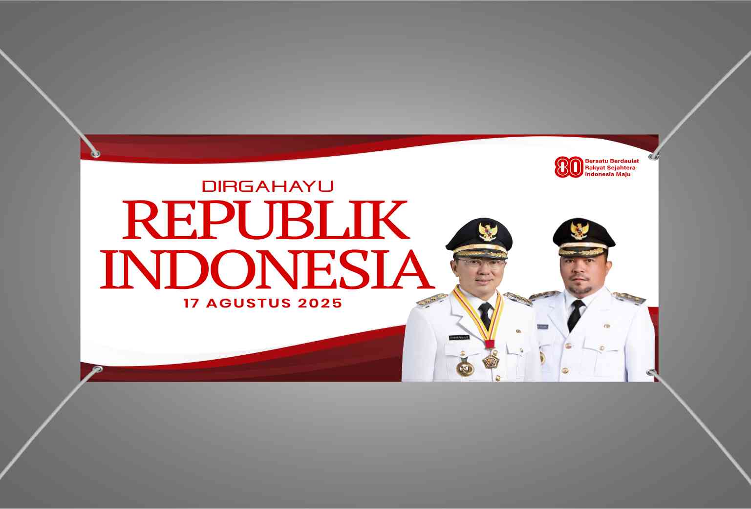 Baliho cetak bertemakan Hari Kemerdekaan Republik Indonesia ini berbentuk persegi panjang horizontal, menampilkan karakter dua pejabat pemerintah berp...