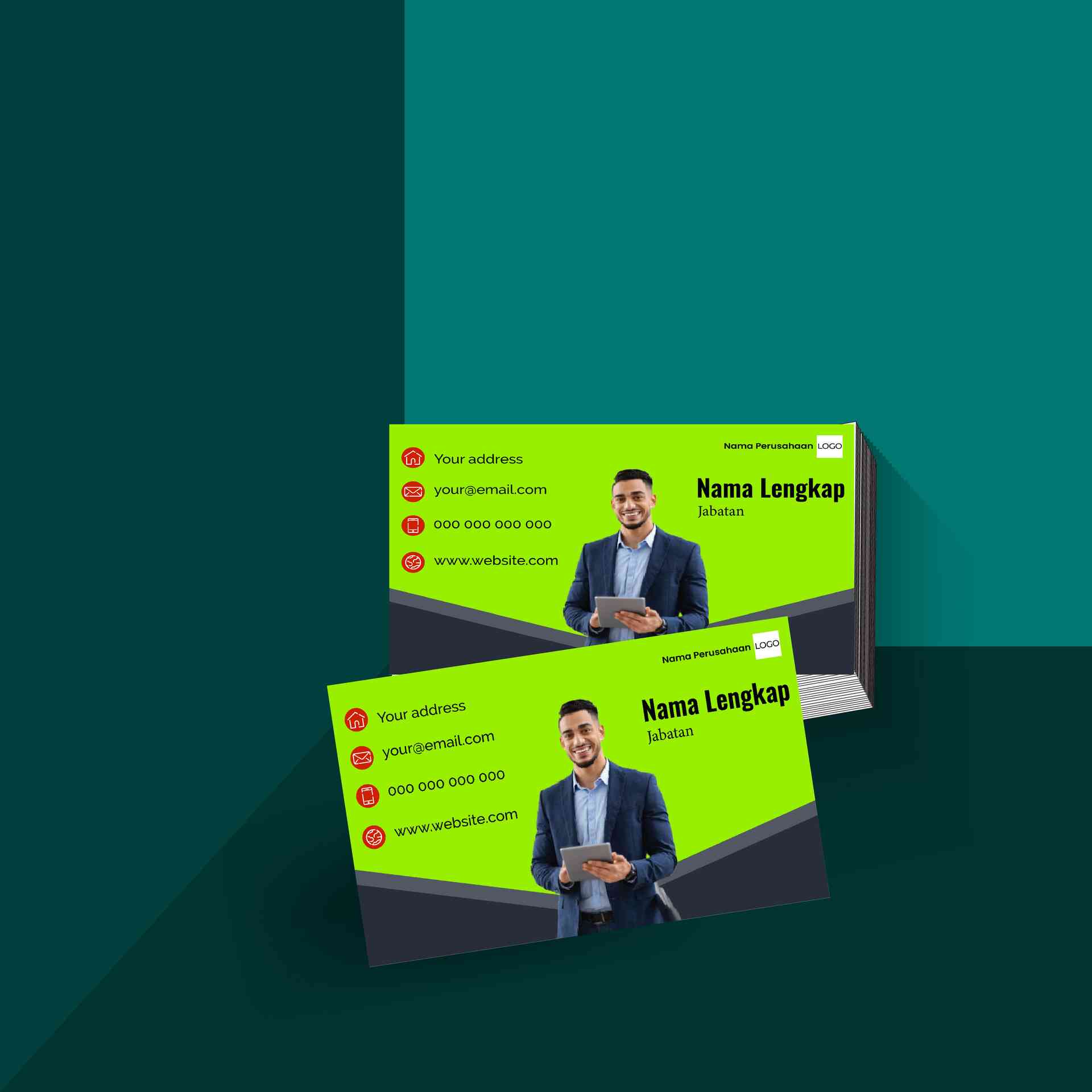 Desain ini tampil mencolok dengan warna hijau yang segar dan penuh energi. Cocok untuk perusahaan berbasis lingkungan, pertanian, kesehatan, atau UMKM...