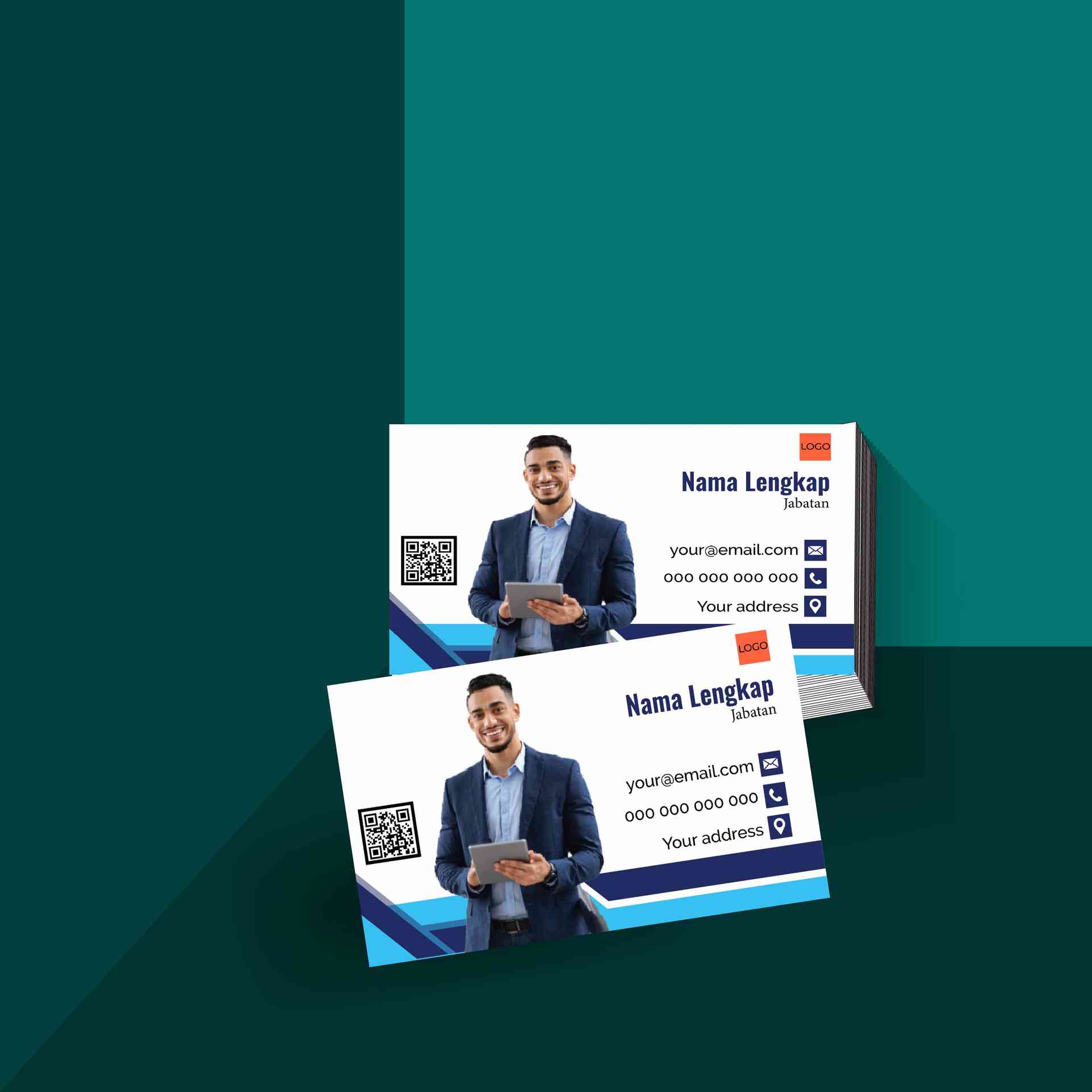Kartu nama bisnis berbentuk persegi panjang dengan kombinasi warna biru dan putih serta elemen aksen geometris biru gelap yang memberikan kesan modern...