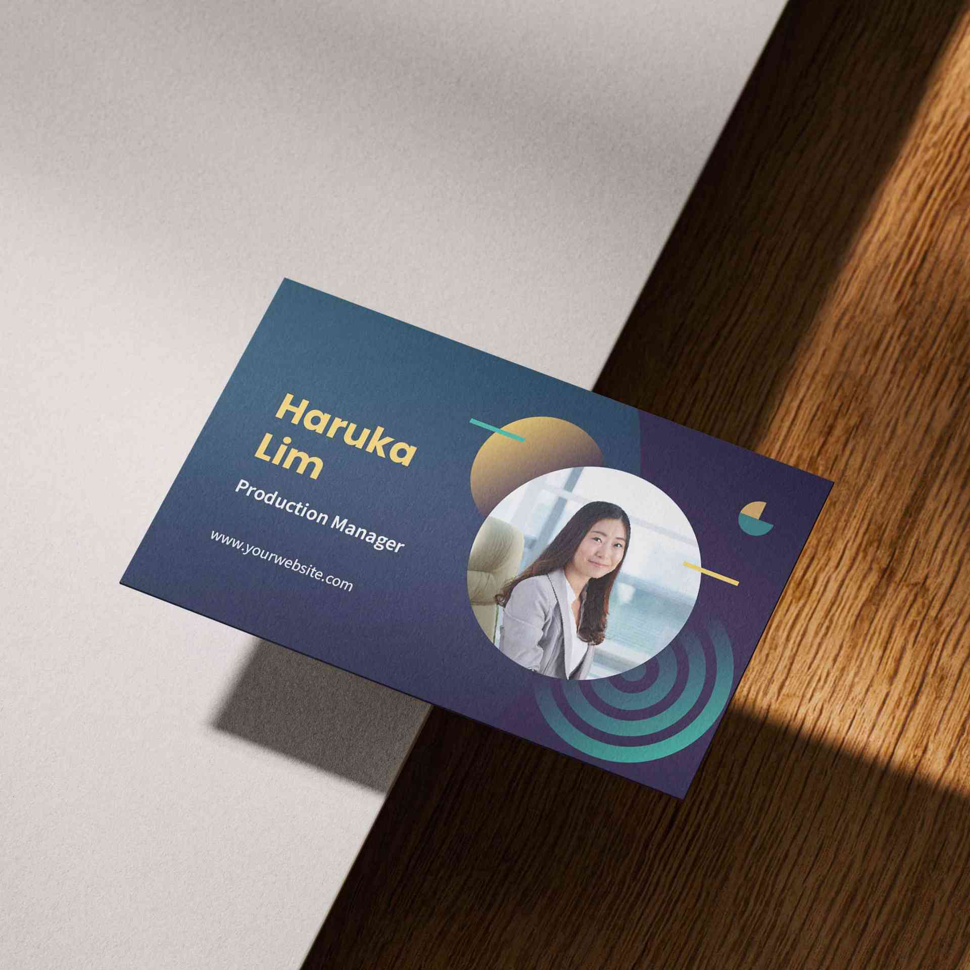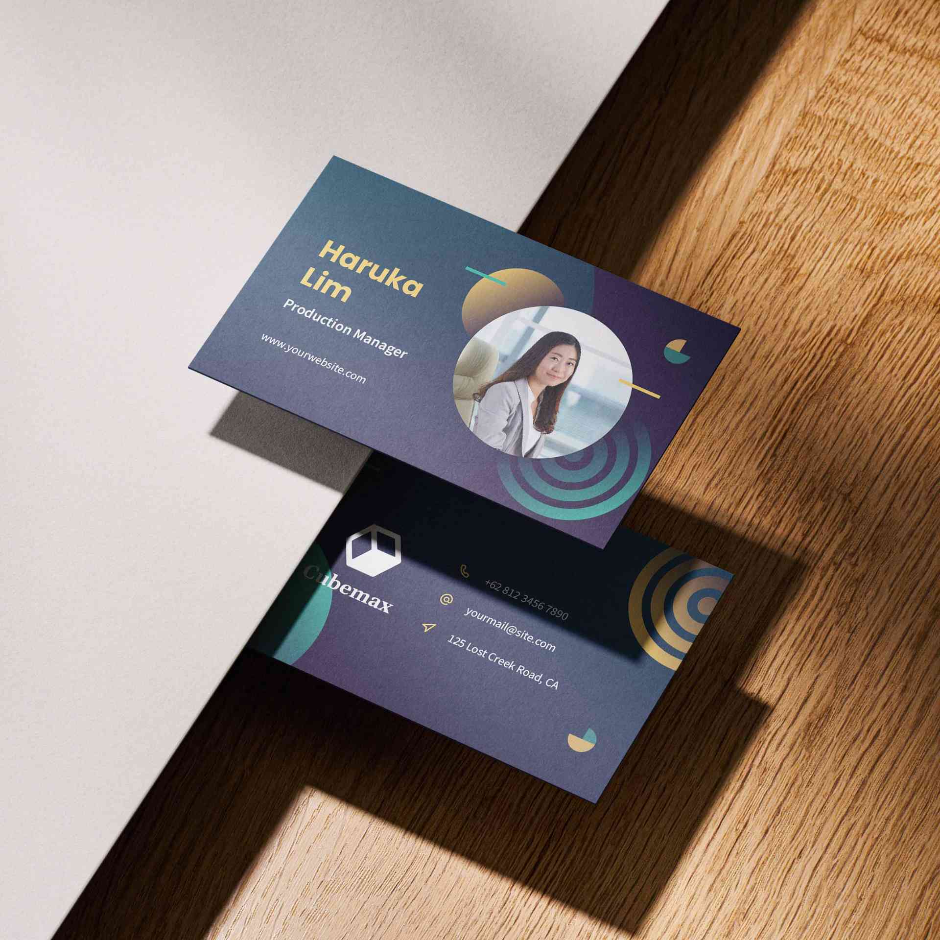 Kartu nama modern ini memiliki bentuk persegi panjang horizontal dengan desain futuristik yang menonjolkan kombinasi warna ungu dan abu-abu sebagai warna dominan, dipadukan aksen garis geometris tajam dan motif layer yang dinamis. Visual utamanya menampilkan kombinasi foto profil profesional dan tata letak informasi kontak yang rapi, membuat elemen nama dan jabatan terlihat tegas dengan tipografi tebal. Tampilan kartu sangat sesuai untuk profesional masa kini, pelaku bisnis, atau startup yang ingin menonjolkan citra modern, inovatif, dan mudah diingat di lingkungan bisnis atau jaringan profesional.
