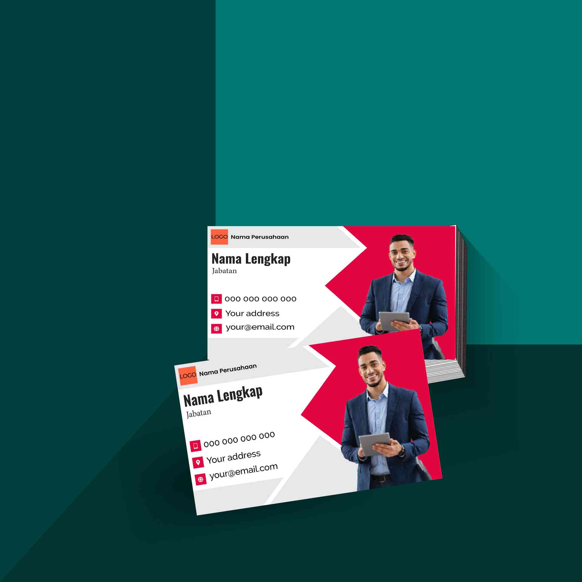 Kartu nama formal berbentuk persegi panjang dengan dominasi warna merah menyala dan abu-abu, menampilkan desain geometris tegas yang memperkuat kesan...