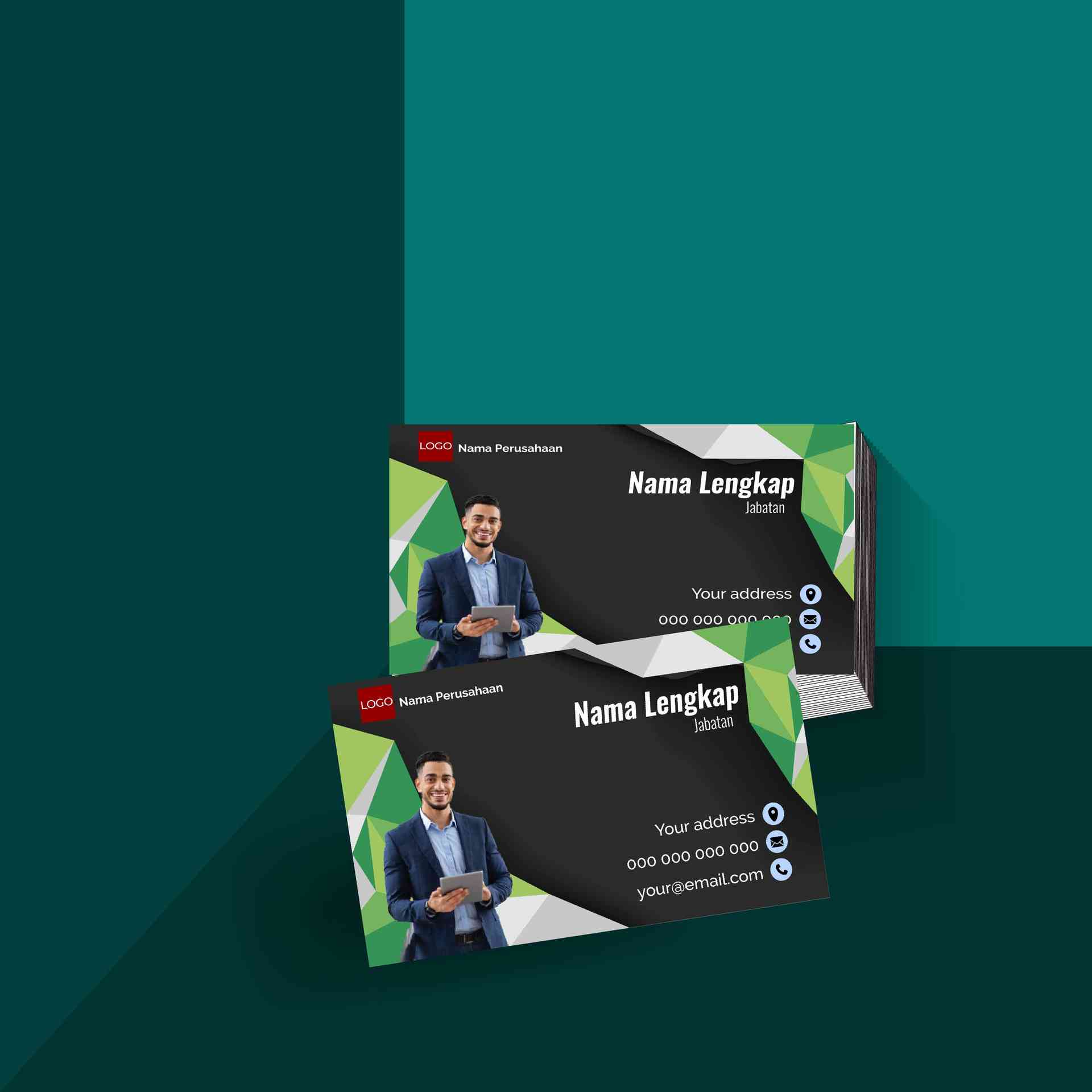 Kartu nama modern ini berbentuk persegi panjang horizontal dengan dominasi warna hitam yang elegan, dipadukan sentuhan visual geometris berwarna hijau...
