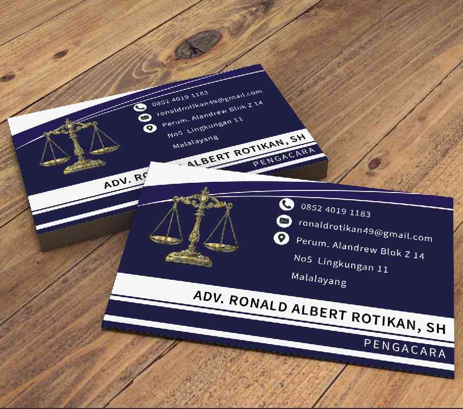 Desain kartu nama ini memadukan nuansa biru tua yang mendalam dengan simbol timbangan keadilan berwarna emas yang ikonik, menciptakan tampilan elegan...