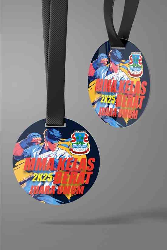 Medali acrylic kejuaraan berbentuk bulat dengan desain visual dinamis menampilkan ilustrasi atlet judo dalam gaya geometris modern, didominasi warna oranye, biru, ungu, dan putih. Tulisan “2K25”, “JUARA UMUM”, dan “JUDO KELAS BERAT” tampil mencolok di bagian depan, memperkuat tema kejuaraan olahraga khususnya cabang judo. Elemen desain yang tegas dan futuristik memperkuat kesan prestisius, ideal digunakan sebagai penghargaan resmi pada turnamen judo atau kompetisi olahraga serupa, dan menyasar penyelenggara event kejuaraan serta instansi terkait di bidang olahraga.