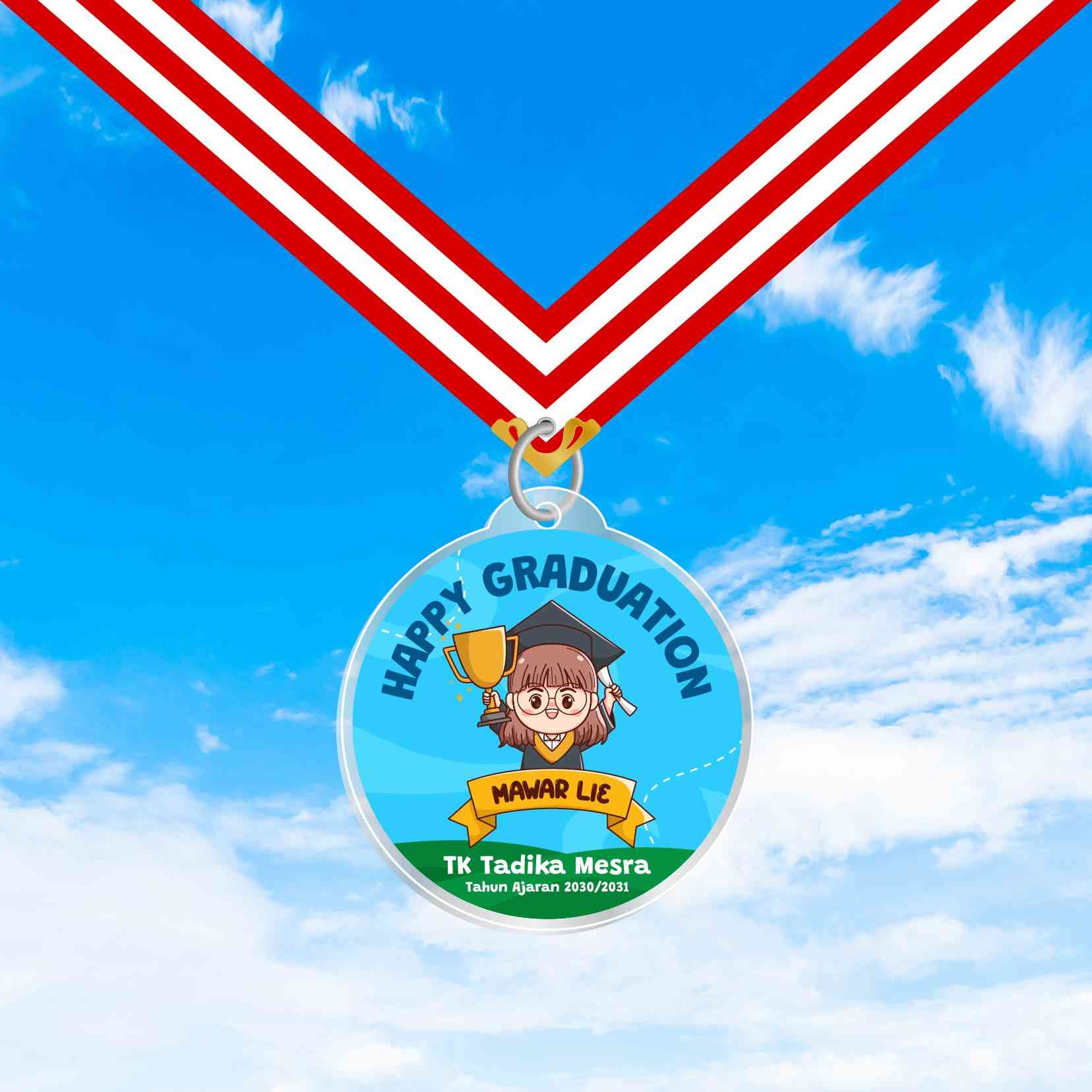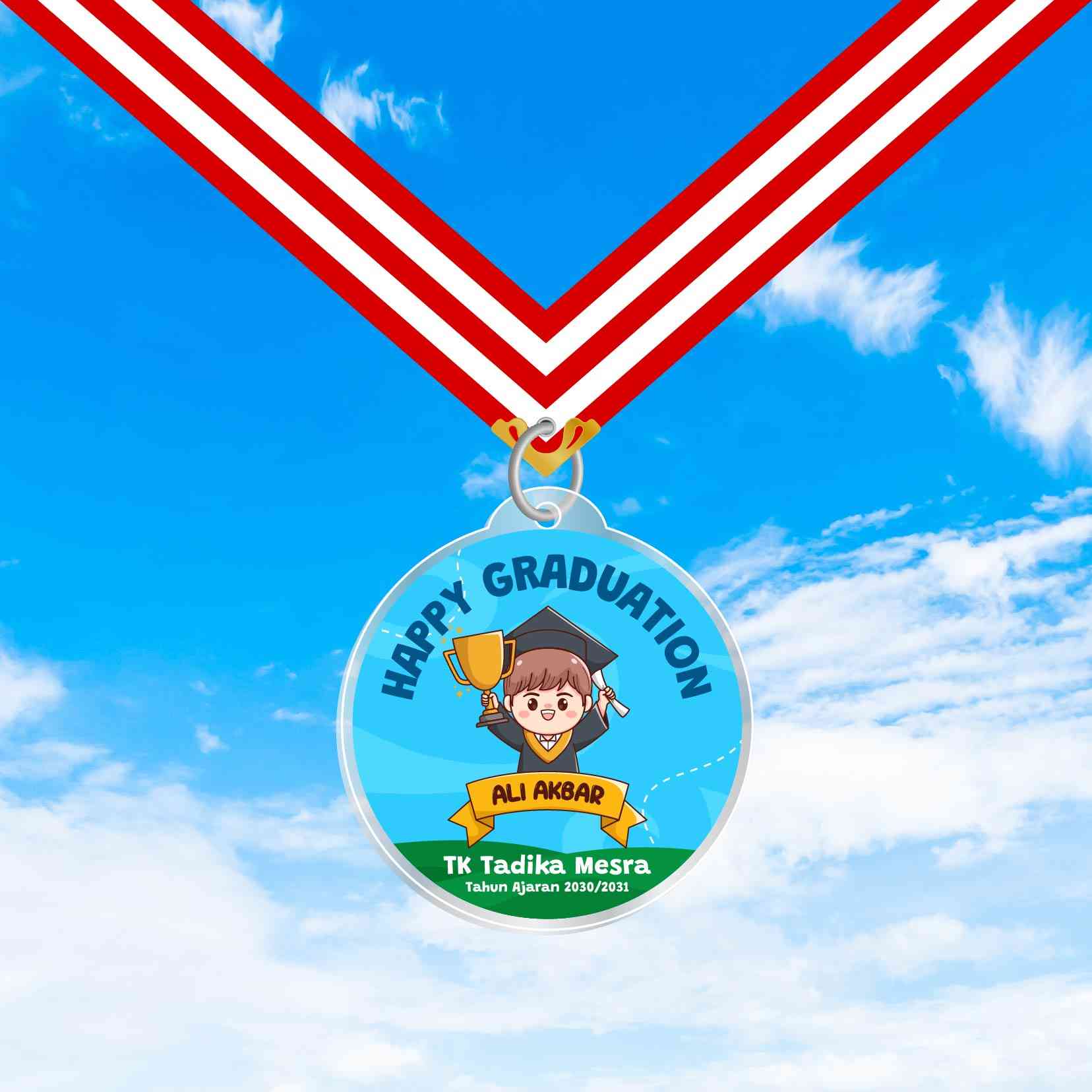 Medali akrilik ini menampilkan karakter anak laki-laki yang ceria mengenakan toga, memegang piala dan ijazahโsimbol semangat dan prestasi! ๐ Dengan l...