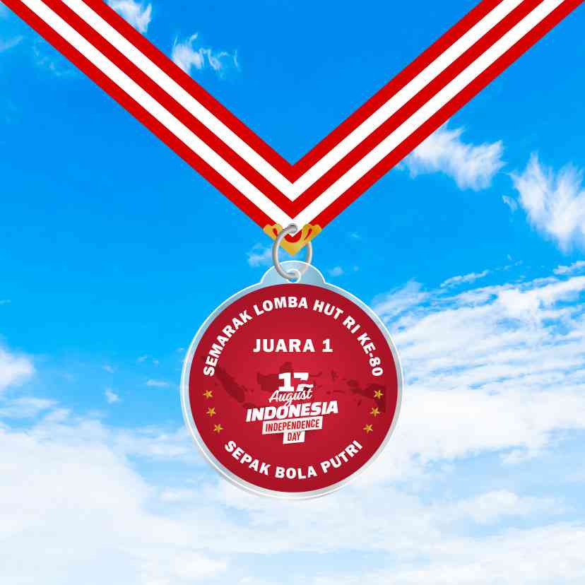 Desain medali ini menonjolkan nuansa ceria dan patriotik, dengan elemen visual bendera dan ornamen khas kemerdekaan. Warna merah-putih yang dominan me...