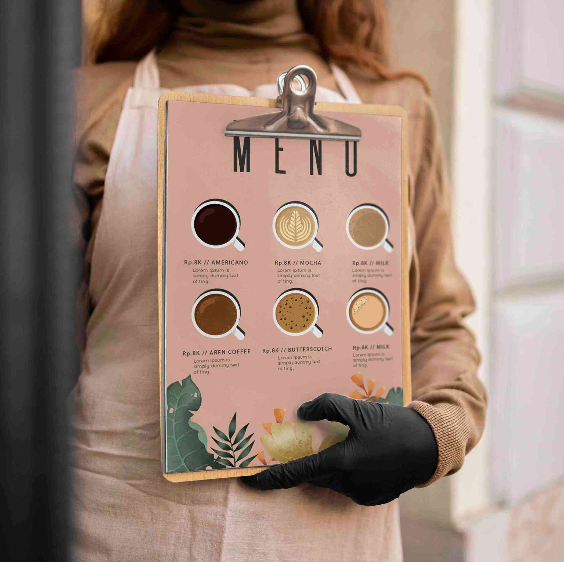 Menu minuman kopi berbentuk lembaran datar dengan desain vertikal, menonjolkan ilustrasi cangkir kopi dan biji kopi sebagai elemen visual utama dengan...