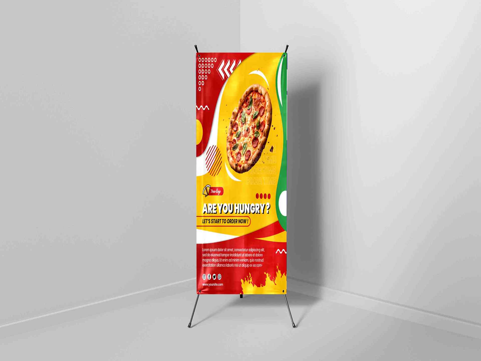 X Banner restoran yang ditampilkan berbentuk vertikal dengan dominasi warna kuning cerah dikombinasikan merah dan putih, menonjolkan gambar pizza besa...