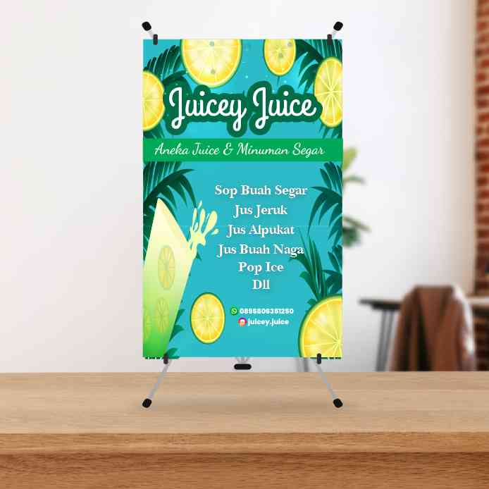 Mini standing banner menu Juicey Juice menggunakan desain vertikal dengan dominasi warna hijau dan biru, dihiasi ilustrasi irisan lemon dan dedaunan t...