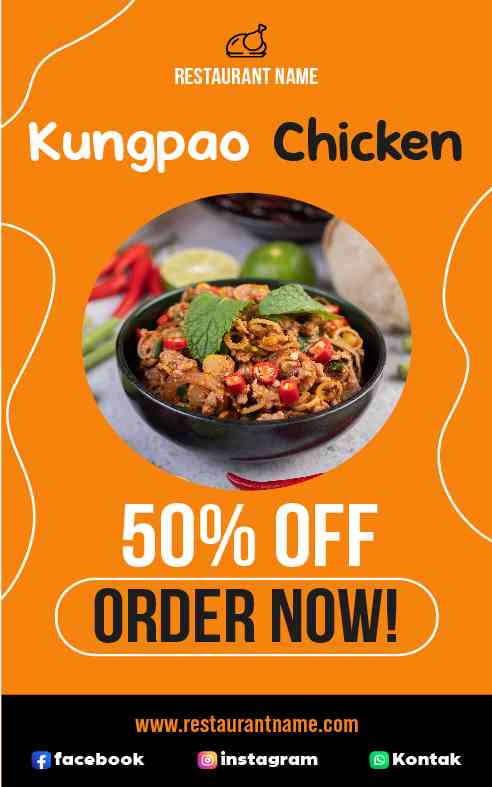 Mini standing banner promosi ini menonjolkan produk makanan Kungpao Chicken dengan visual utama berupa foto close-up hidangan ayam berbumbu pedas dan...