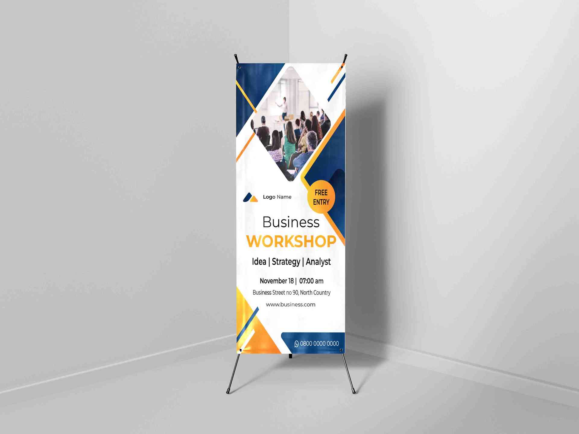 Mini standing banner ini berbentuk vertikal dengan dominasi warna biru tua, kuning tua, dan putih, menampilkan desain modern yang tegas dengan garis-garis diagonal dan elemen geometris. Fokus utamanya ialah promosi seminar atau workshop bertema bisnis, terlihat dari tulisan besar "Business WORKSHOP" dan detail informasi acara seperti tanggal, waktu, tempat, serta informasi kontak. Elemen visual menonjol berupa lingkaran kuning bertuliskan "FREE ENTRY" serta penempatan logo di bagian atas. Produk ini sangat cocok digunakan untuk event bisnis, seminar, atau workshop, ditujukan bagi peserta profesional atau komunitas bisnis yang membutuhkan informasi acara secara menarik dan jelas.