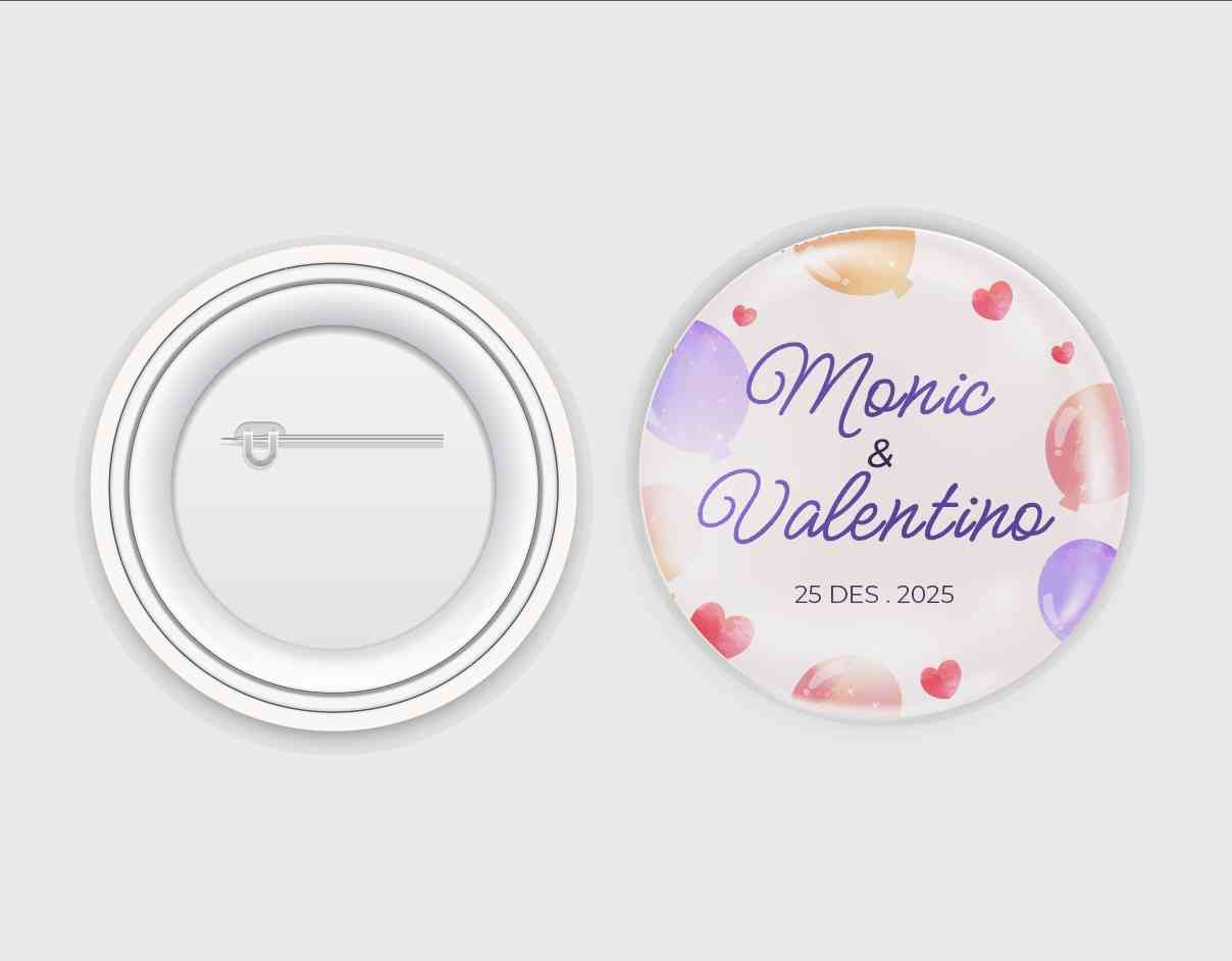 Pin peniti ini menampilkan desain ceria dengan balon warna-warni dan hati lucu, memberikan kesan bahagia dan penuh warna pada hari pernikahan. Nama pa...