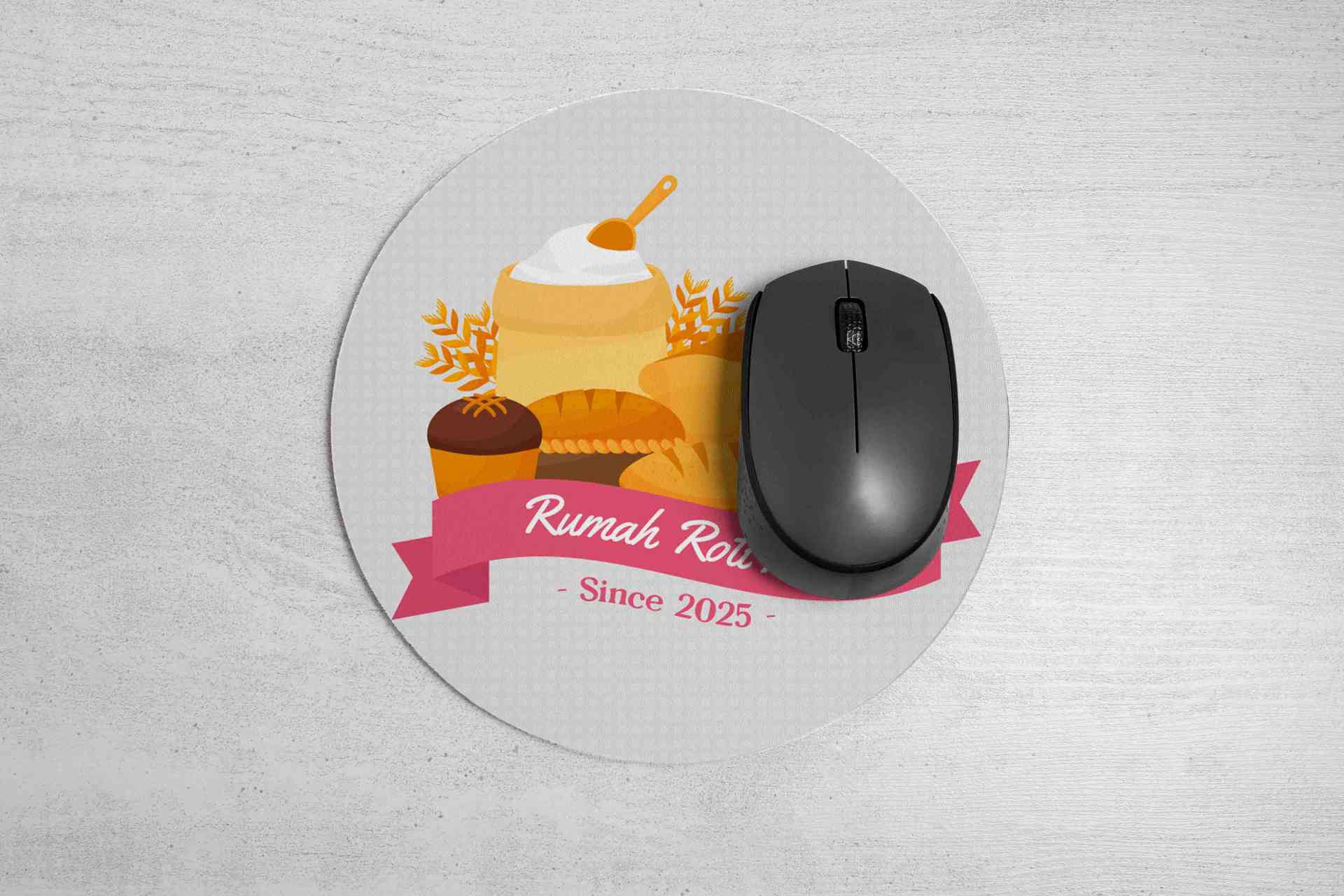 Mousepad ini menghadirkan nuansa hangat dan manis khas dapur bakery rumahan. Dengan latar pink pastel yang lembut, desain ini dihiasi ilustrasi roti baguette, pretzel, muffin, dan gandum, lengkap dengan peralatan baking seperti rolling pin, oven mitt, dan sendok takar. Teks "Bakery – Since 2025" tercetak di tengah dengan gaya tulisan yang elegan namun tetap friendly. Cocok untuk pelaku bisnis bakery, pecinta baking, atau sebagai merchandise lucu bertema kue dan roti. Desain ini membawa kesan feminin, kreatif, dan cocok sebagai hadiah atau media promosi UMKM makanan.