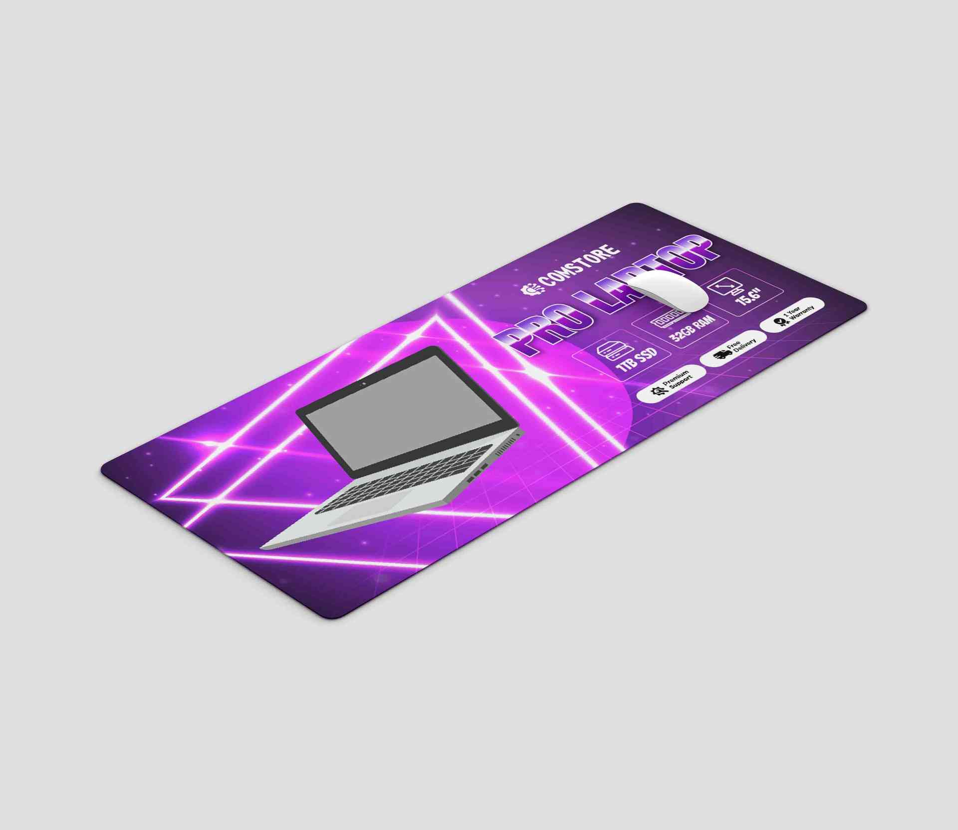 Mousepad ini menampilkan desain bertema teknologi dengan latar ungu neon bergaris grid dan efek cahaya segitiga yang futuristik. Di tengah terdapat il...