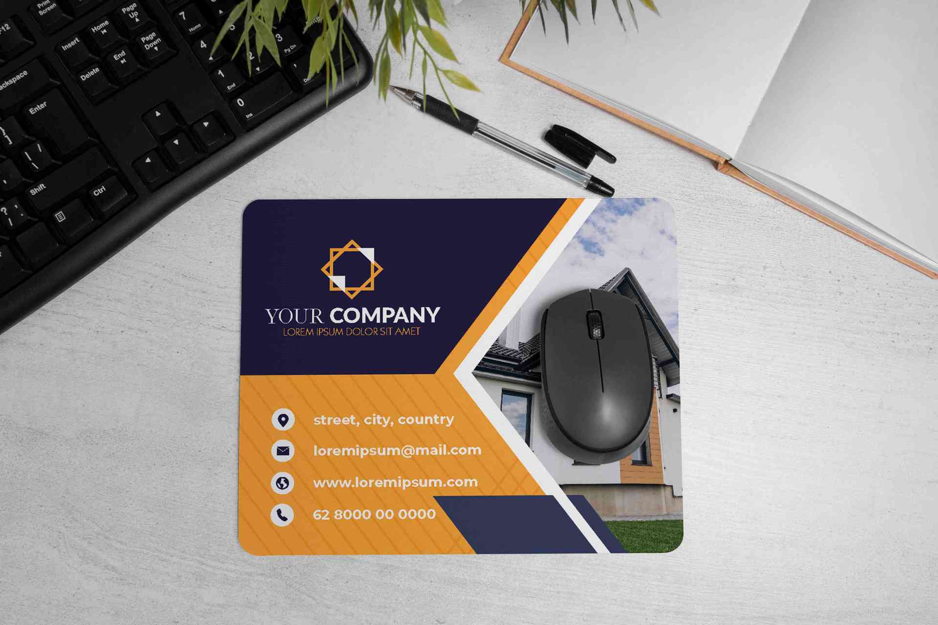 Mousepad ini dirancang khusus untuk kebutuhan branding bisnis properti, arsitektur, atau developer. Dengan latar belakang dominan warna biru navy dan...