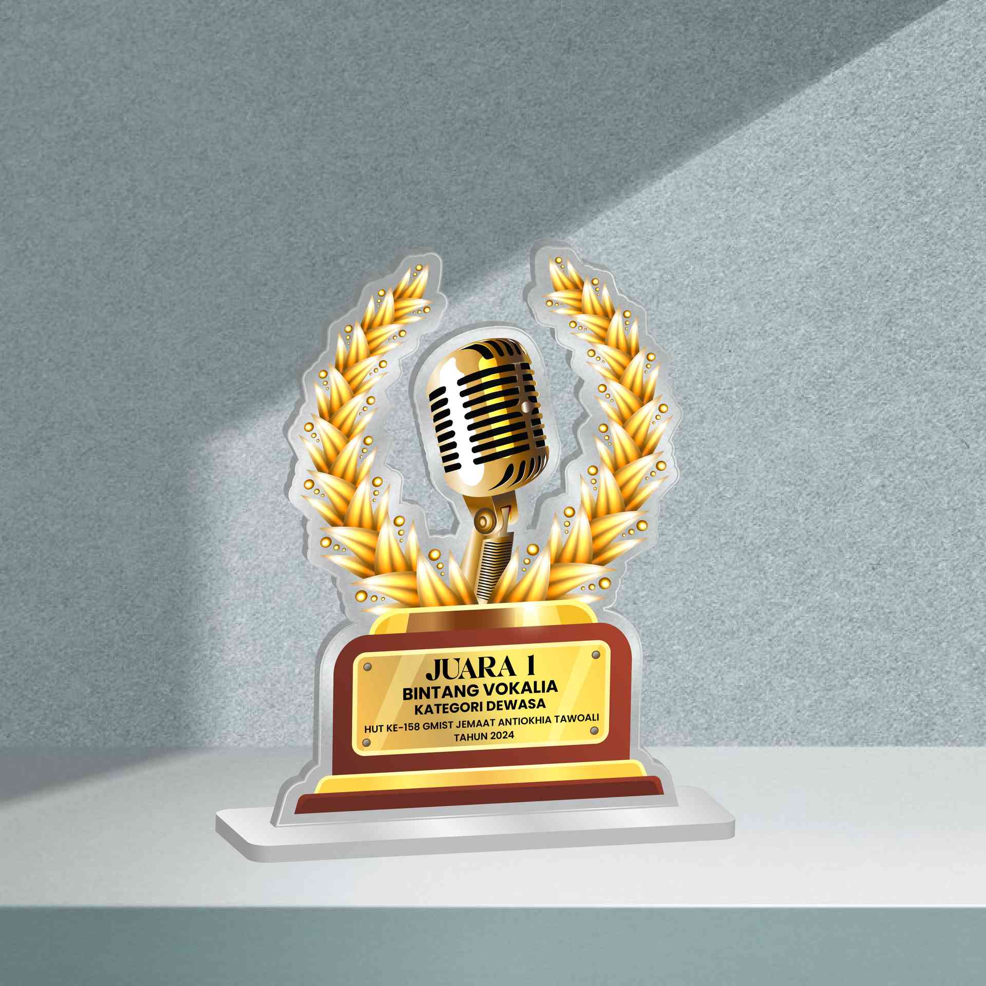 Plakat akrilik ini memiliki desain yang elegan dan prestisius, dengan mikrofon emas sebagai elemen utama yang melambangkan dunia vokal dan seni tarik...