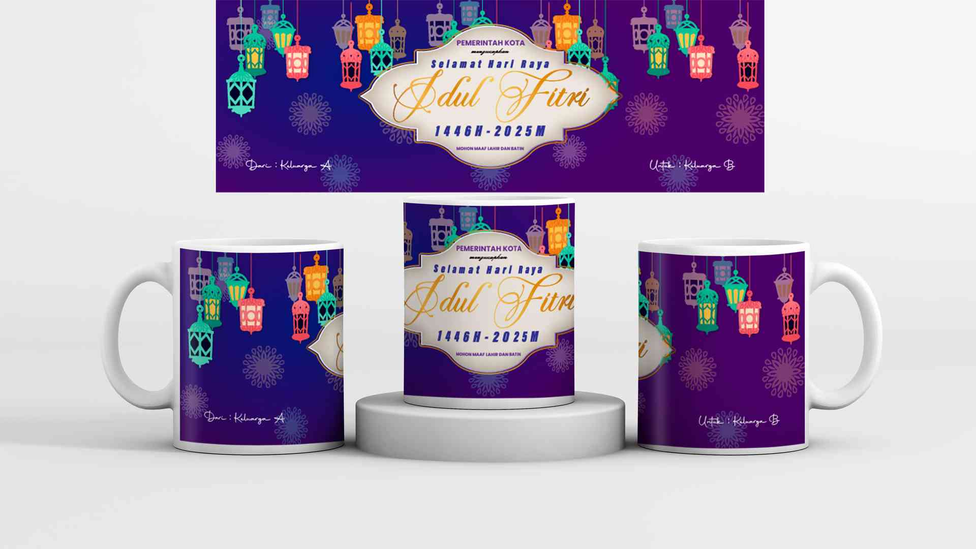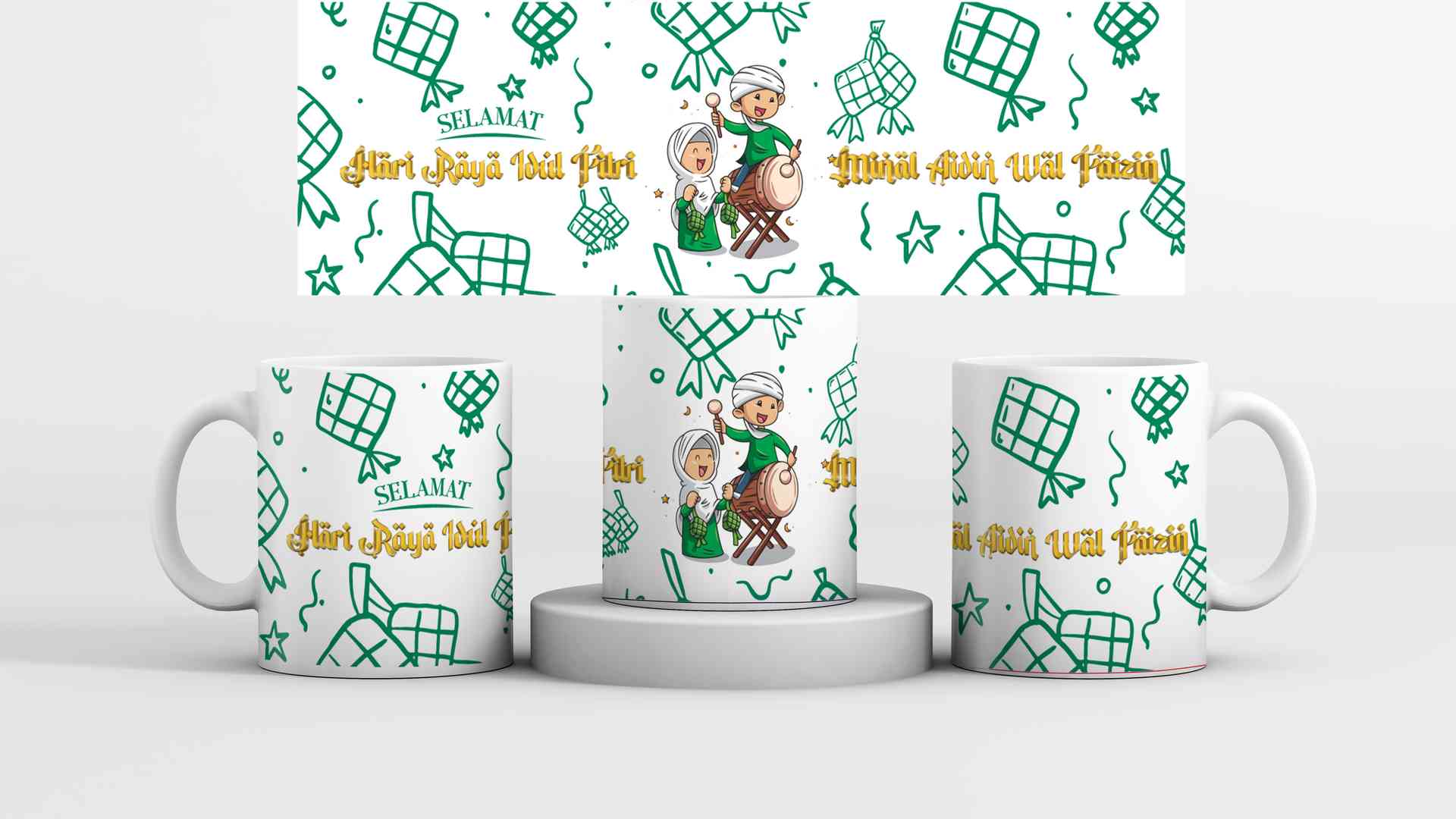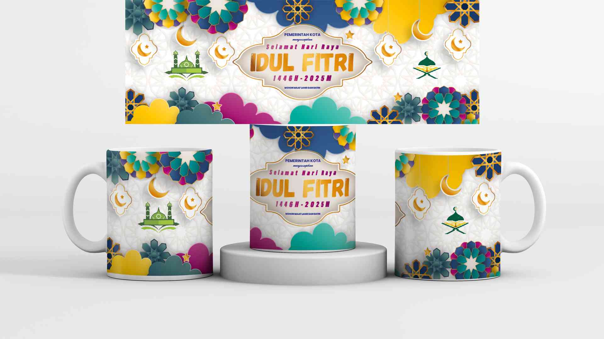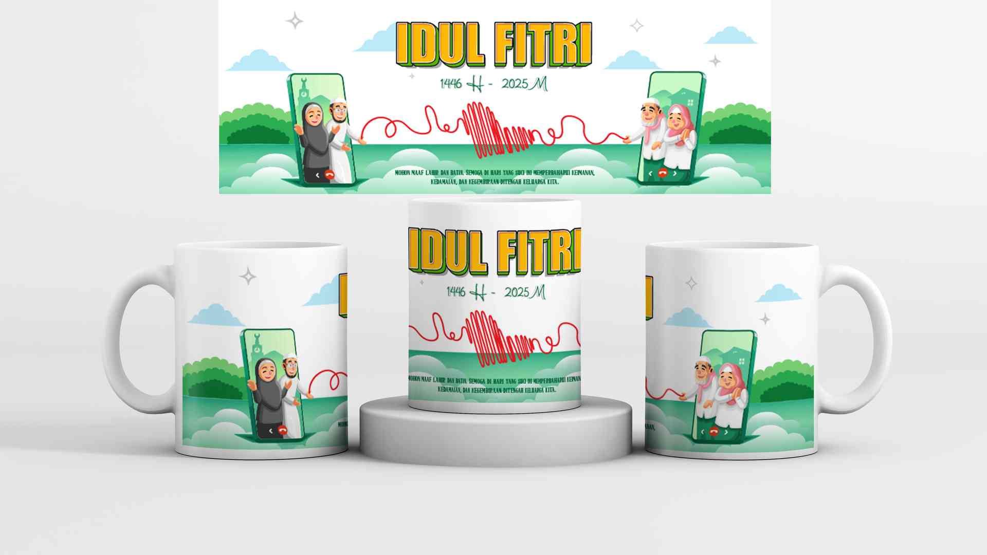 Gambar utama dengan tulisan "IDUL FITRI" berada di tengah mug, yang menjadi titik fokus utama saat mug digunakan.Sisi kiri dan kanan mug menampilkan o...