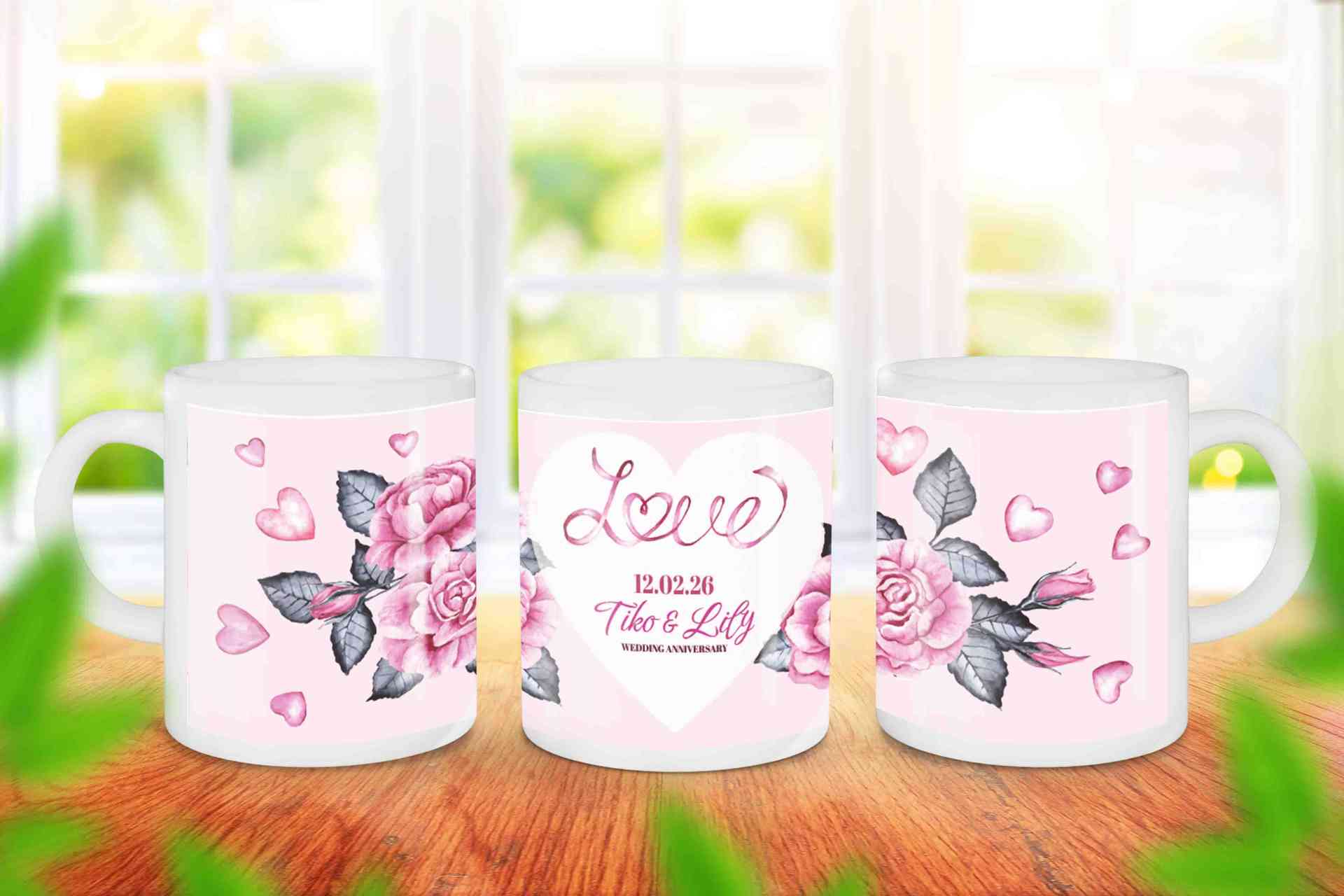 Mug souvenir couple bertema penuh cinta dan bunga menampilkan desain utama berupa ilustrasi bunga mawar merah muda yang elegan, berpadu dengan elemen...
