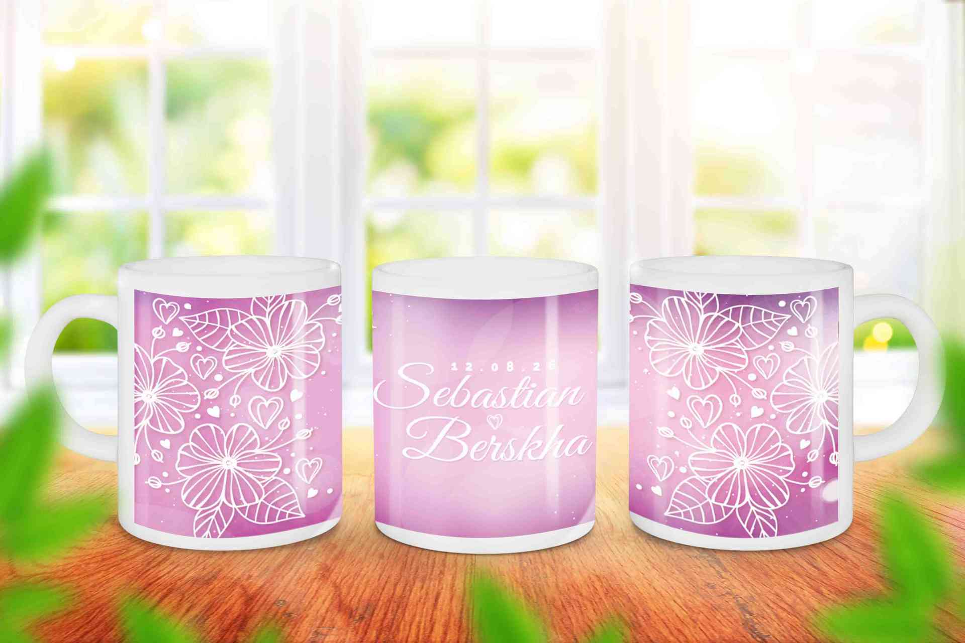 Mug souvenir pernikahan berbentuk silinder dengan pegangan di satu sisi ini menonjolkan desain elegan bertema bunga dengan dominasi warna putih pada l...