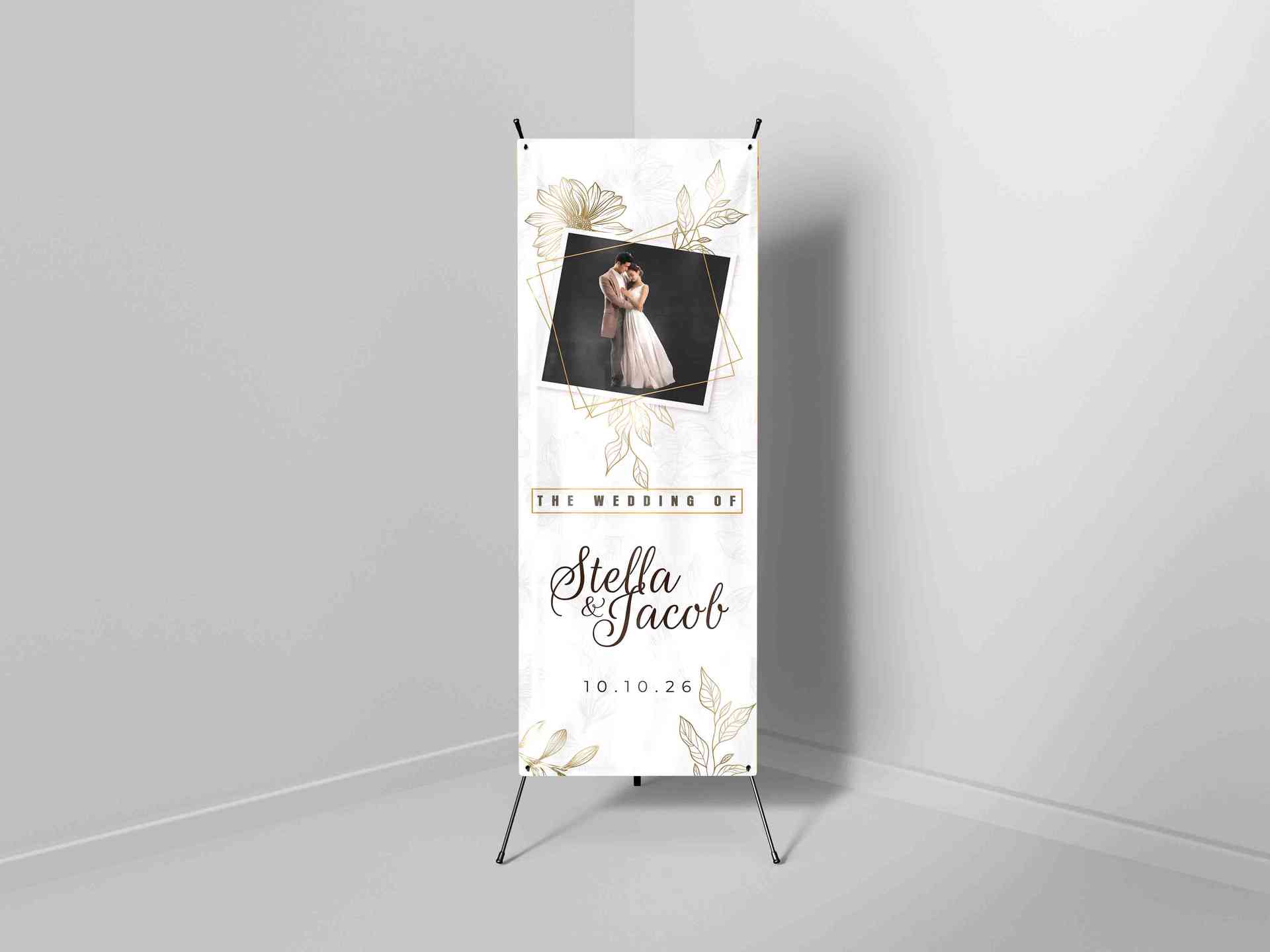 X-banner ini menampilkan konsep minimalis yang elegan dengan dominasi warna putih bersih dan aksen floral emas. Di bagian atas, terdapat foto pasangan...
