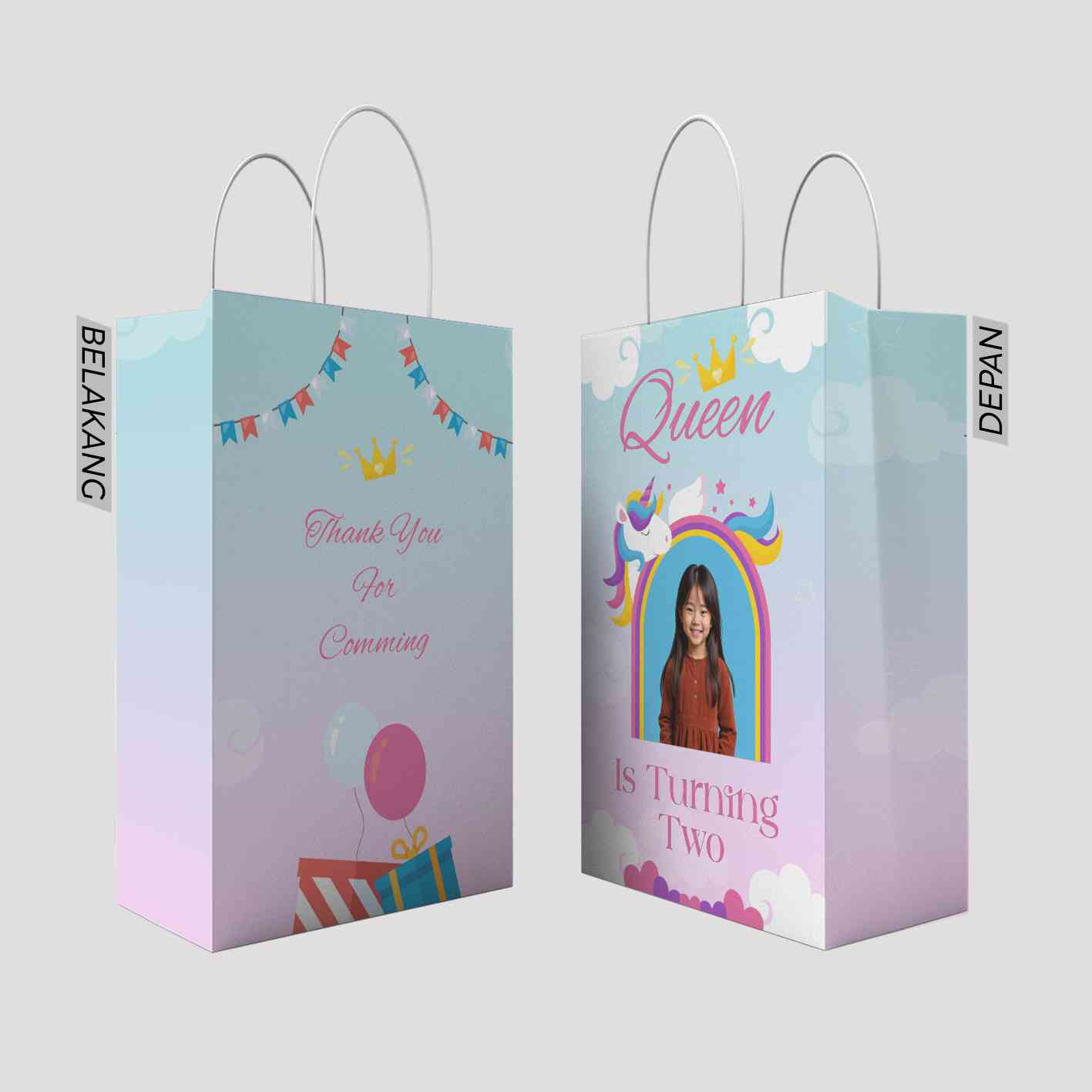 Tas kertas ulang tahun dengan desain manis dan penuh warna yang cocok untuk pesta ulang tahun anak perempuan yang berusia dua tahun. Di bagian depan t...