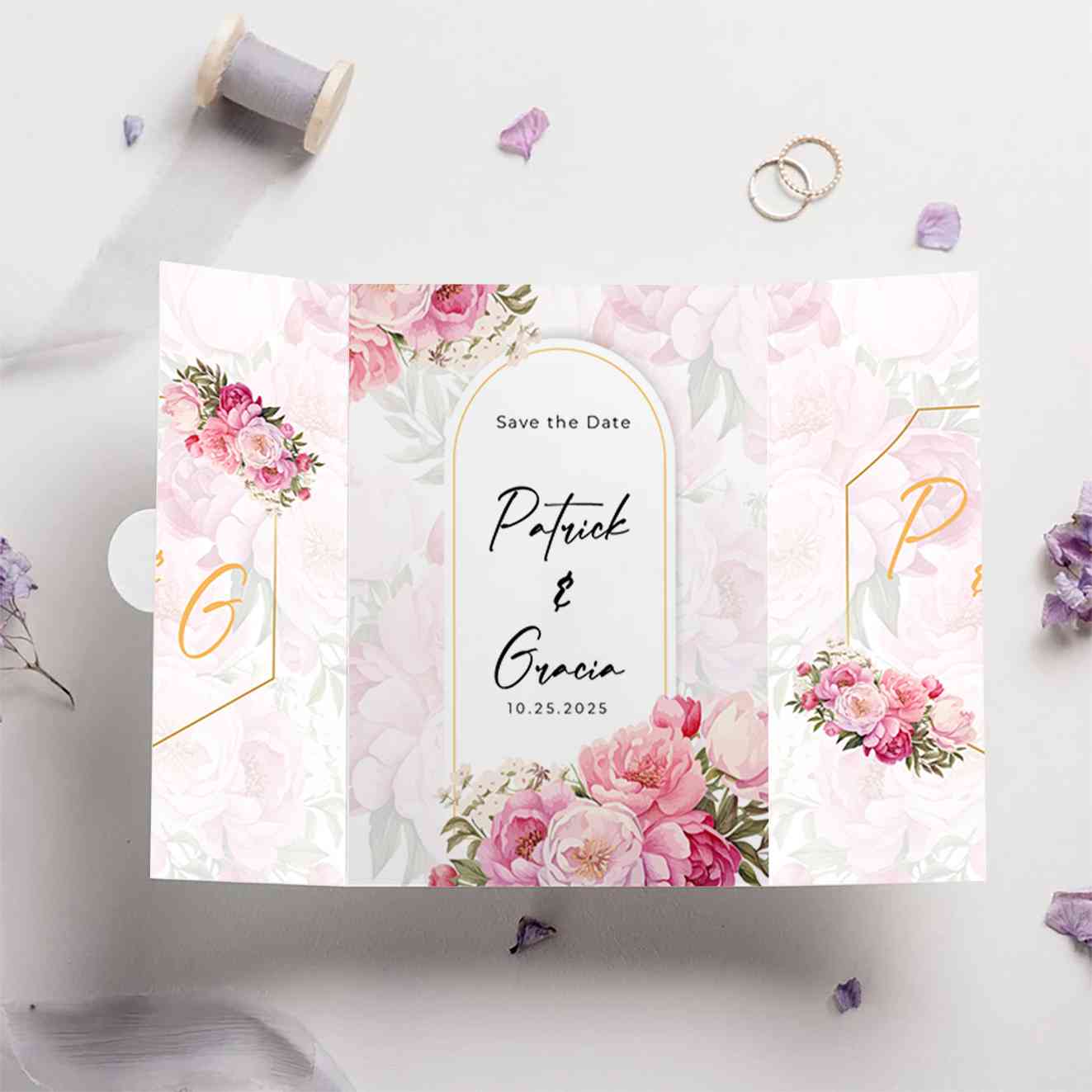 Undangan pernikahan trifold dengan desain floral elegan ini memiliki bentuk lipat tiga yang simetris, menonjolkan ilustrasi bunga-bunga berwarna pink,...
