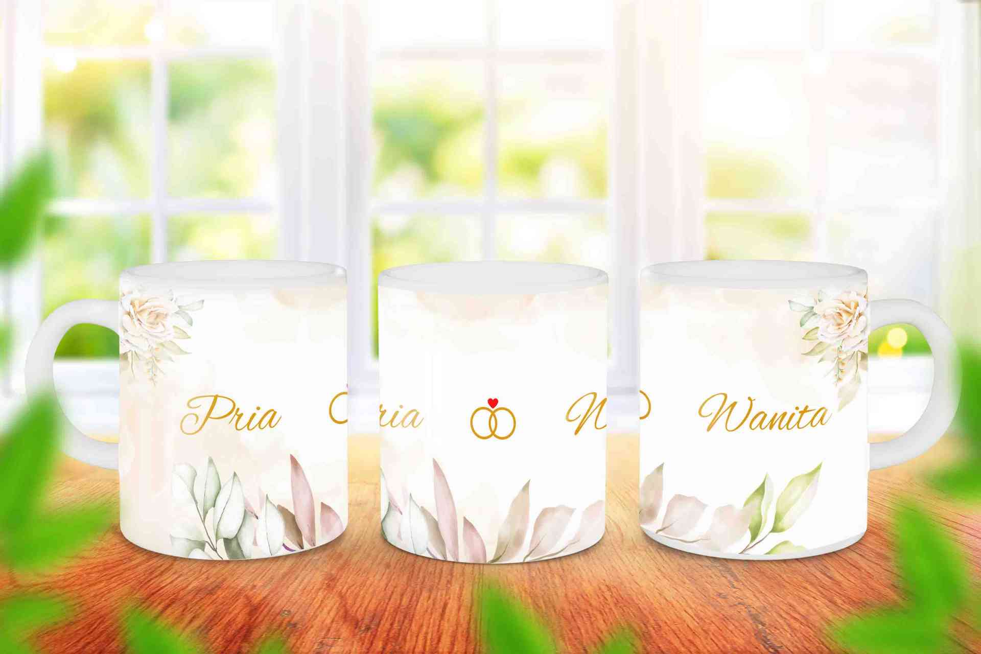 Souvenir Mug Wedding bertema “Terlukis Indah dalam Kasih Tuhan” tampil dengan bentuk mug putih silinder klasik, dihiasi ilustrasi bunga dan dedaunan l...